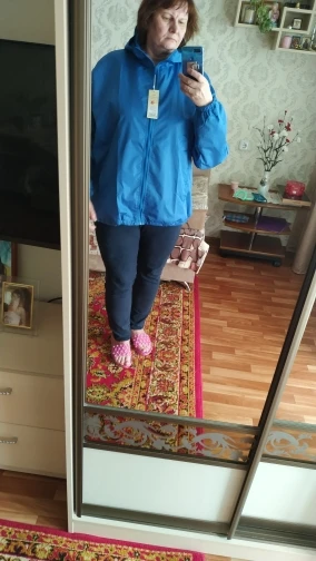 Покупала ветровку на дождливую погоду, но проверить еще рано, время года не соответствует. Внешне очень хорошая, аккуратно пошита, на подкладе, на 52 размер русский отлично. Немного разочаровалась в цвете, На фото куртка более синяя, по факту почти черная. Подумываю заказать другого цвета. Покупкой очень довольна.