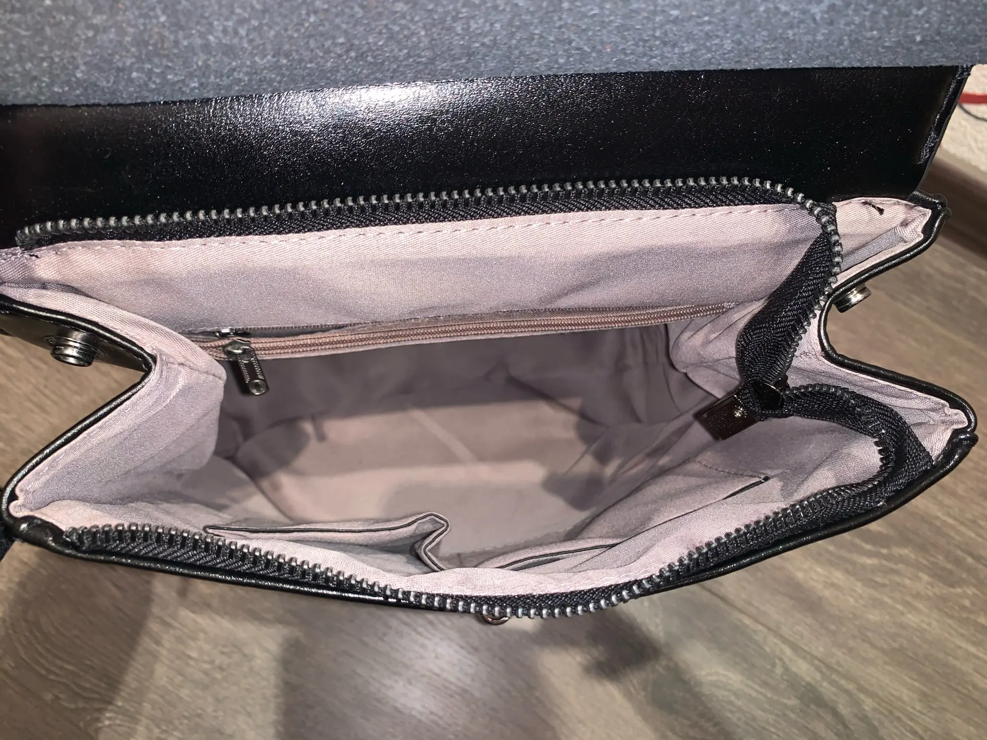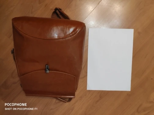 немного больше чем ожидала. на вид и на ощупь кожзам. карманов много! вход узкий, думаю будут проблемы. проверю в повседневнем использовании