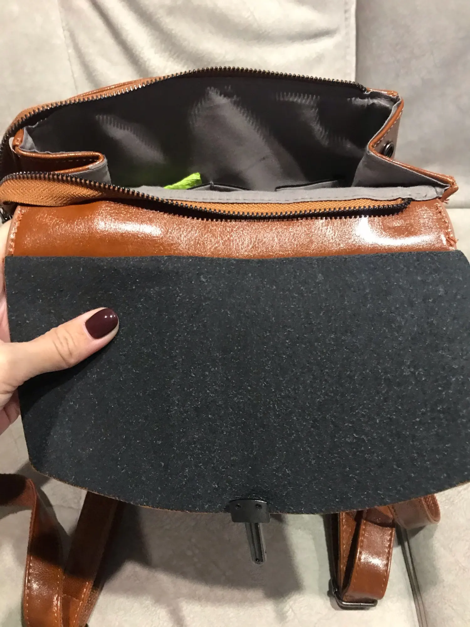 Заказ прибыл даже раньше срока, упакован был хорошо, внутри пакет воздушный и рюкзак не помялся. Молнии все работают, карманов много для мелочей, кожа приятная на ощупь, есть небольшой запах, но это не критично, внутри небольшой подарочек( брелок) Рюкзак понравился, продавца рекомендую, пять звёзд!!!