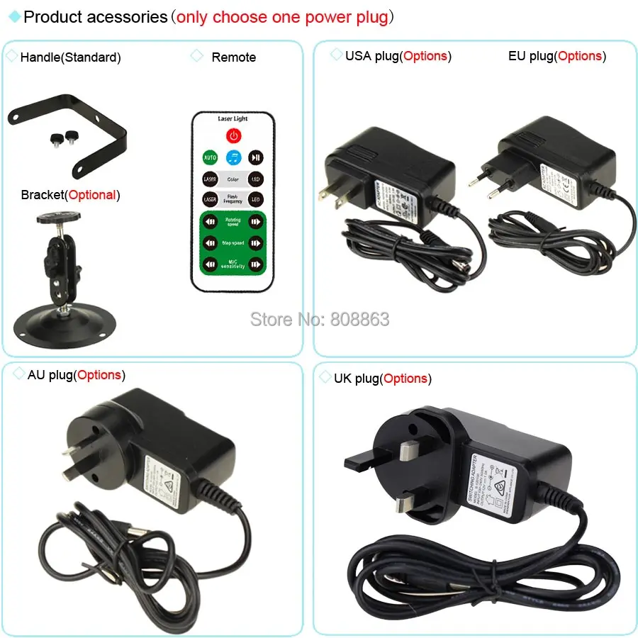 ИК-пульт дистанционного управления: Остановите двигатель до узора/Выберите режим работы/Выберите цвет лазера/Выберите светодиодный/микрофон;
