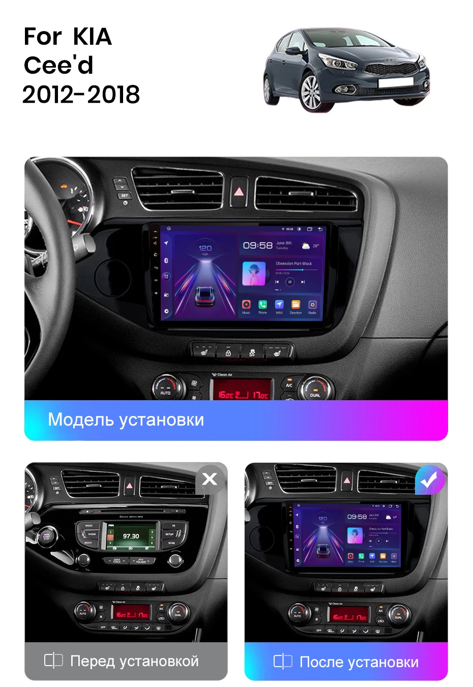 Очень хороший продукт <3 сенсационный экран, GPS, YouTube, tylnia камеры и все показано на фотографиях. Простая установка. Рамка идеально подходит для Kia Ceed. Ничего не купите! Доставка в течение 3 дней :)