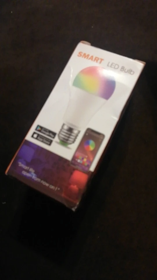 Коробка пришла мятая, но лампа целая. Управляется с приложение HappyLightning . Есть небольшая задержка при включении света, по сравнению со стандартными лампочками.