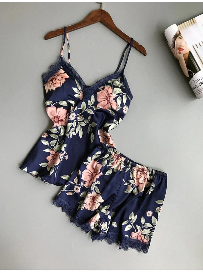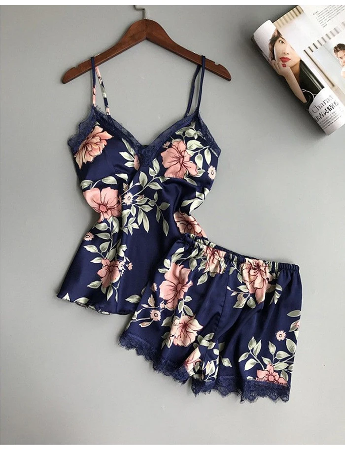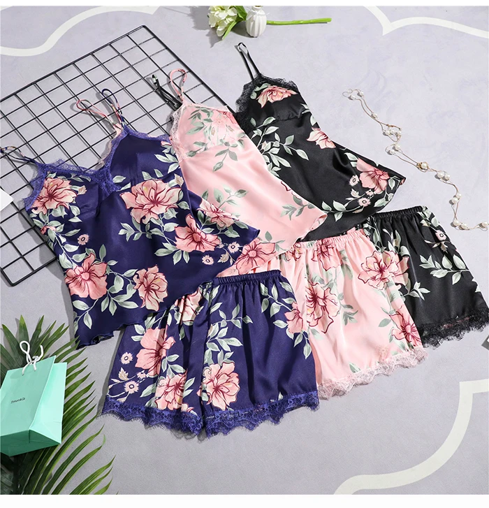 Сексуальная атласная пижама для женщин, летняя Пижама для женщин с нагрудным подкладом, Пижама для сна, пижамный комплект для женщин, модные пижамы с цветами