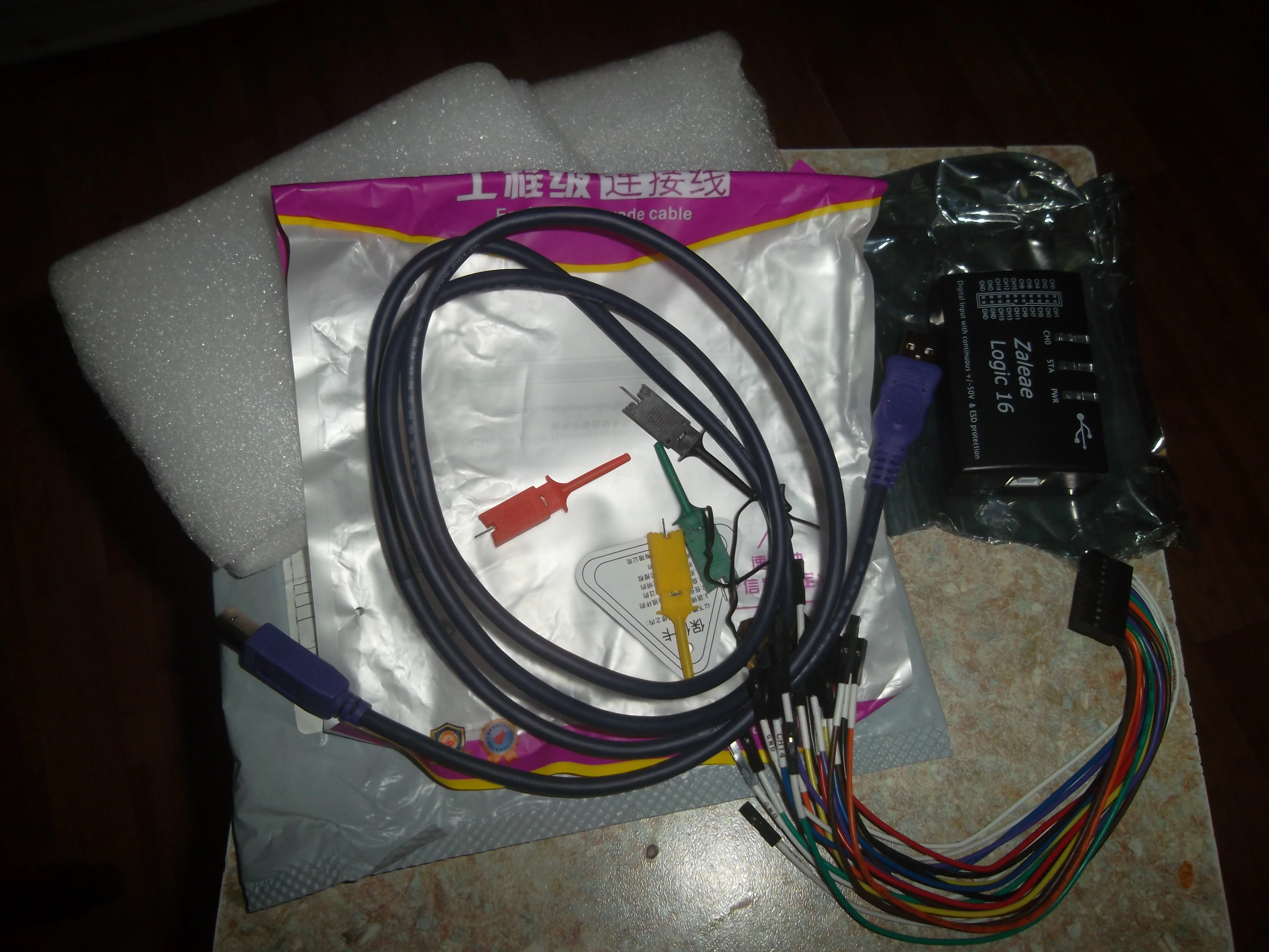 Посылка прибыла довольно быстро. Инструмент соответствует описанию. Небольшая разница-имя напечатано на коробке "Zaleae Logic16". Уже протестирован с sigrok, он работает. Эластичные тестовые зонды, канал отмечен на каждом конце. Высококачественный USB кабель. Не говоря уже о симпатичном фиолетовом цвете;) инструмент работает с SIGROK на Linux (кто-то спрашивал об этом здесь), но мне нужно получить прошивку из оригинального официального «логического» бинарного, И копирование 3 файлов в sigrok. Одна небольшая проблема-советы по испытаниям. Черные разъемы слишком широкие снаружи (2,8 мм, но должны быть 2,54 мм; Для imperial 0,11 "vs 0,1") И если вы Попытайтесь подключить их несколько в ряд на Многоконтактный разъем, они не подойдут. Раствор заменяет все 16 пластиковых наконечников. Нижняя линия-я рекомендую товар и продавцу.