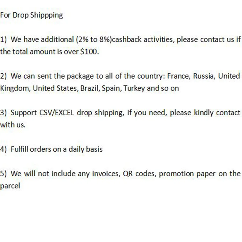 У нас есть дополнительные (от 1% до 10%) операции кэшбэка, пожалуйста, свяжитесь с нами, если общая сумма превышает $100. Мы можем отправить посылку во все страны: Франция, Россия, Великобритания, США, Бразилия, Испания, Турция и так далее Поддержка прямых поставок CSV/EXCEL, если вам нужно, пожалуйста, свяжитесь с нами. Выполнение заказов ежедневно Мы не включаем в посылку счета-фактуры, QR-коды, рекламную бумагуДоставка: