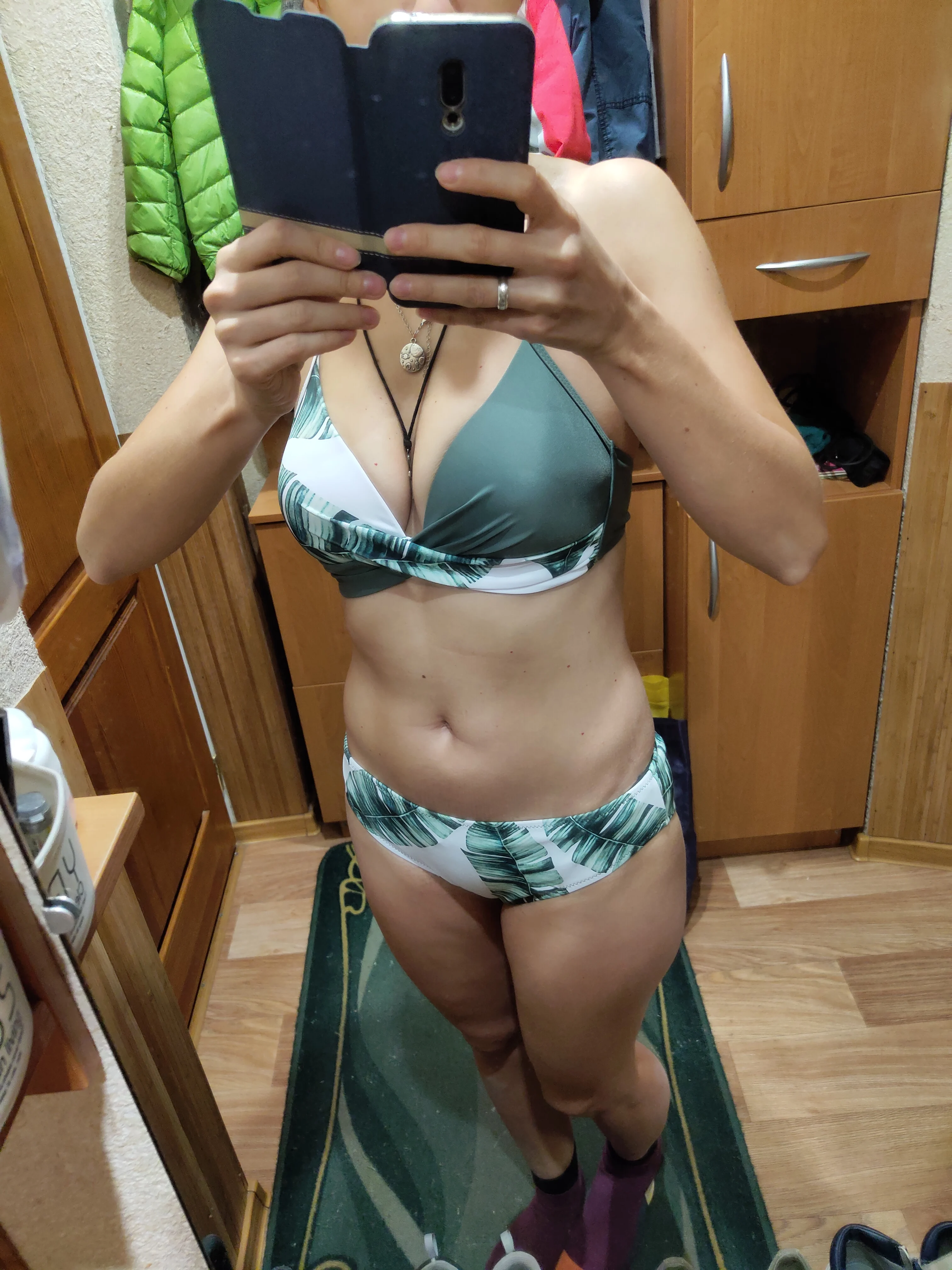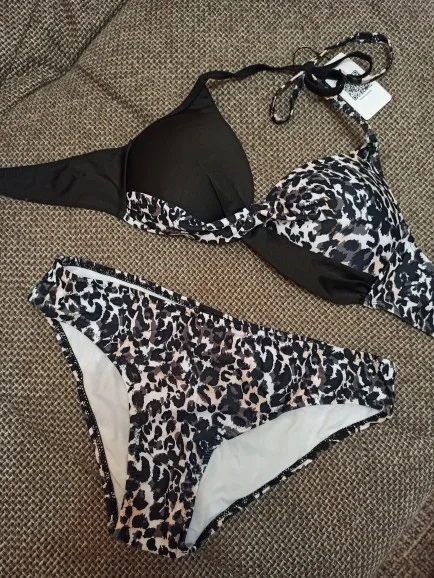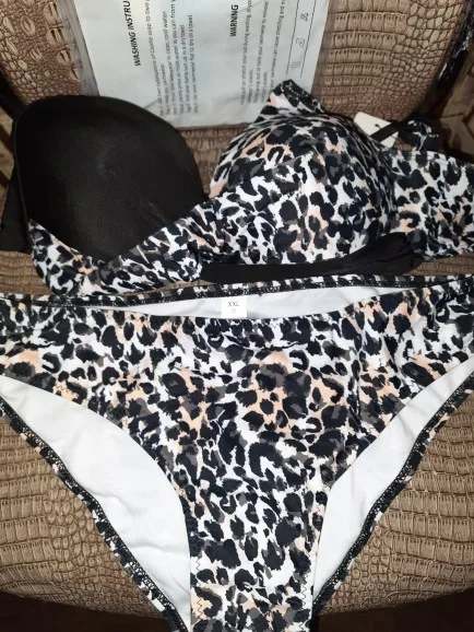 Купальник взяла по размерной сетке своего размера М. Верх просто отличный, грудь держит хорошо, ничего не вываливается, можно смело плавать, валяться загорать... Форма чашек красивая, небольшой пушап даже проблемную грудь после ГВ сделал приличной. Трусы не понравились, какой-то фасон "прощай молодость"... Широкий бок - репетузы, блин, если есть галифе, как в моем случае - это фиаско. Ноги как окорока сразу. Я взяла черные плавки от другого купальника, благо сочетание двух цветов в модели позволяют комбинировать. И - да, леопардовый с черным принт - на загорелом теле смотрится шикарно. Доехала посылка до РнД за 11 дней, отслеживалась. Я очень рада, что купила этот купальник, без примерки так угадать, это просто фантастика!
