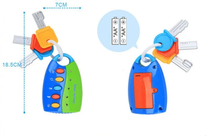 Музыкальный Брелок с 3 пластиковыми ключами, идентичными фотографии. Работает с 2 батареями, не поставляемыми. У меня есть только 2 маленьких заусенца: игрушка слишком большая, чтобы держать в руке (9-месячный ребенок), и шум слишком громкий. Но в остальном эта игрушка отличная. Я очень доволен!!! Заказал 20/01 прибыл 03/02.