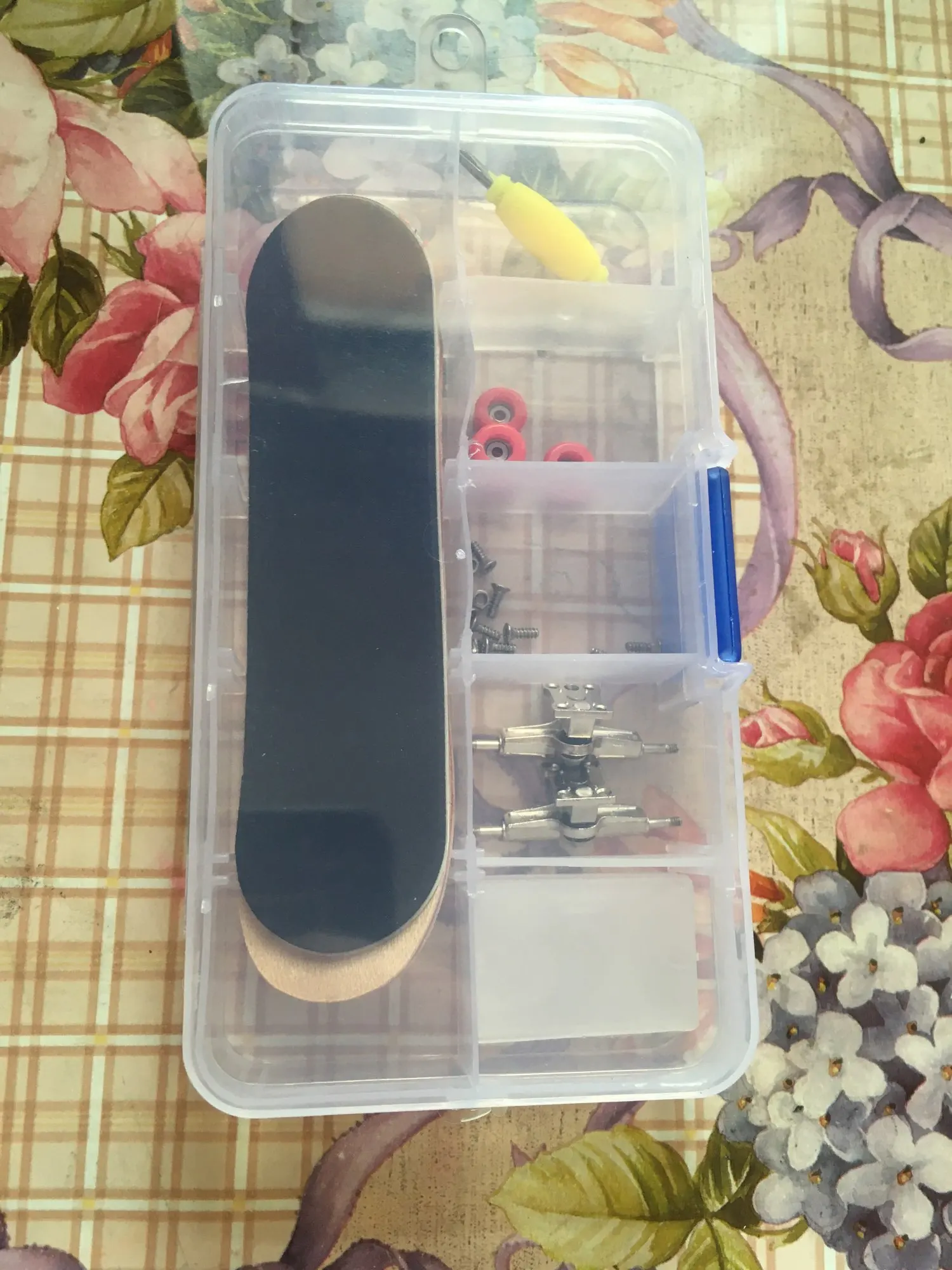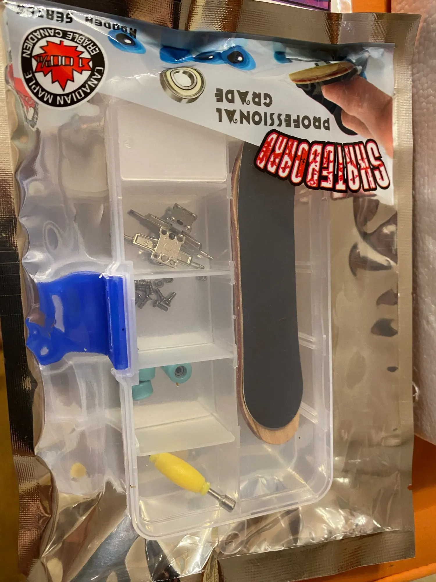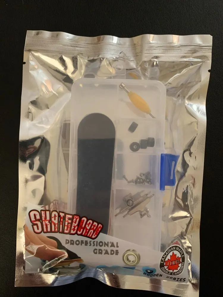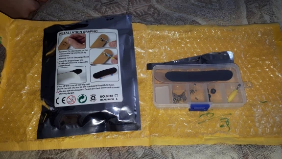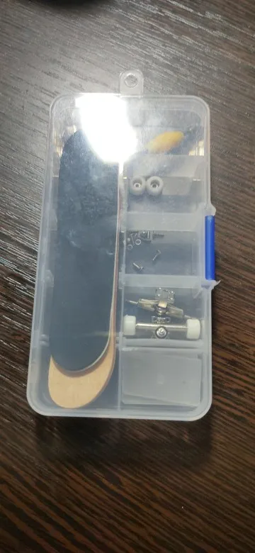 Фингерборд разобран по запчастям, упакован в пластиковой коробочке, каждый вид запчастей в отдельной ячейке. В комплекте малюсенькая отвёртка ) Выглядит прикольно. Пока не собирали. Подарим ребёнку на Новый год. Заказывал 11.11, доставка в Екатеринбург около 25 дней в объединённой посылке.