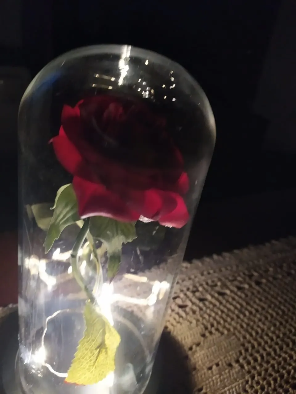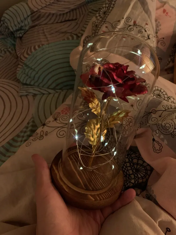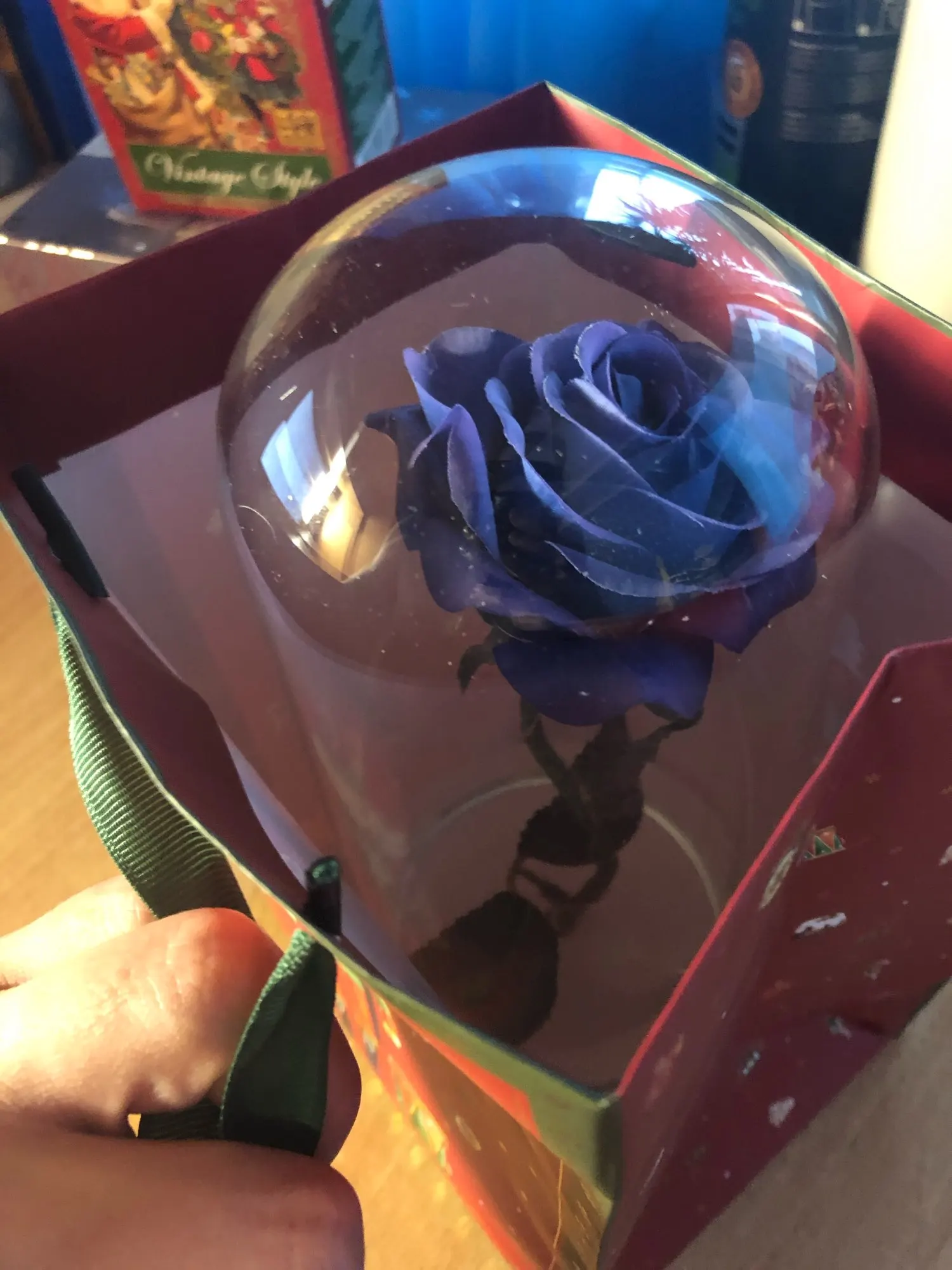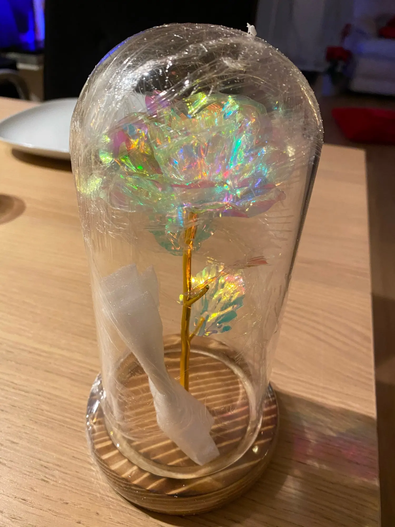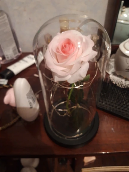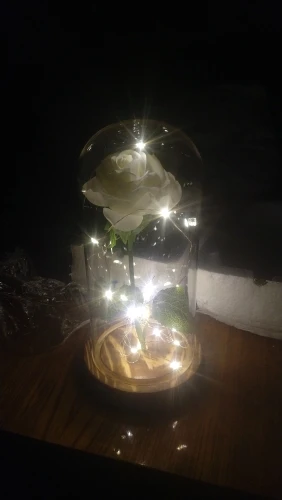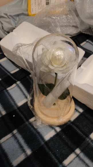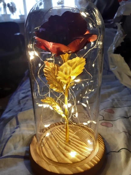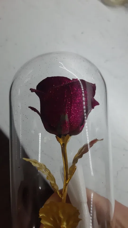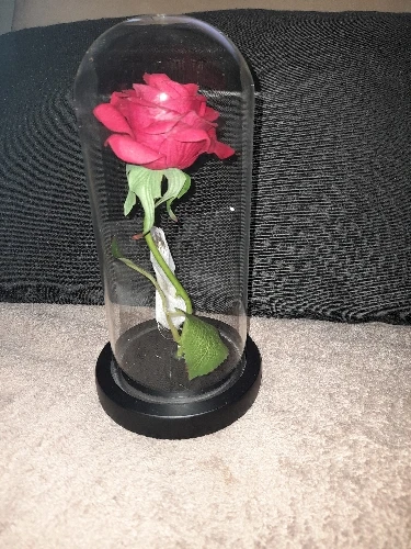Он пришел в точности вовремя, и выглядит очень красиво! Роза была упакована в целости и сохранности. Я утомил его немедленно, и он работает безупречно. Стеклянный купол-это стекло, будьте осторожны во время распаковки! Вам понадобится 3 аккумулятора тройного размера для освещения, люк в нижней части очень легко открывается, 10/10-определенно рекомендую.
