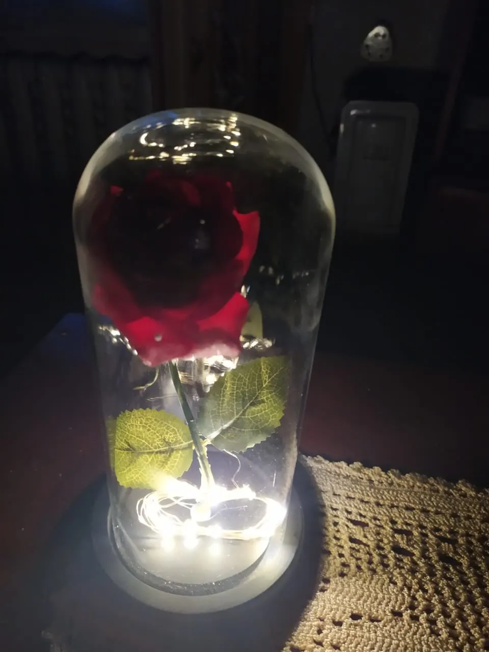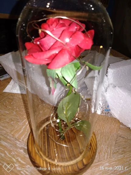 Достаточно долго шла до Челябинска, товар понравился, очень красивый, колба и гирлянда не нагревается, требуется 3 мизинчиковые батарейки! При распаковке, досочка пахнет деревом, будто недавно ее вырезали, Роза не приклеена, но держится не плохо. Гирлянда длинноватая, мучались как бы ее красиво сделать в колбе. В целом рекомендую, стоит своей цены!