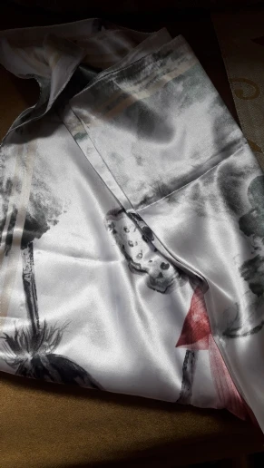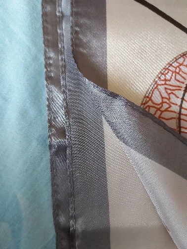 Платок из полиэстера средней плотности, швы на окантовкой ровные, без брака, печать рисунка четкая, цвета насыщенные, приятные. Заказывала за 204 руб. Товаром довольна.