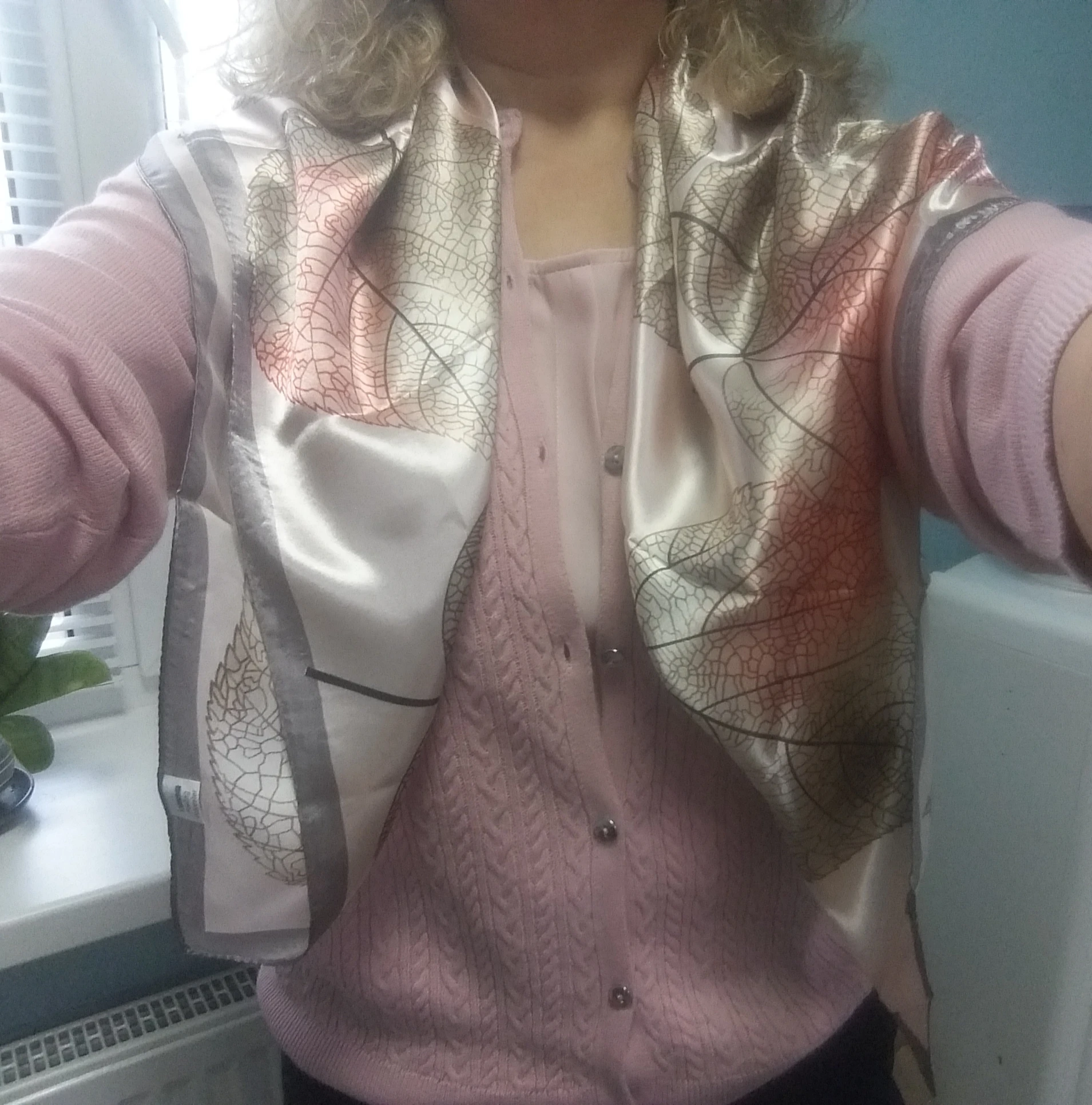 Очень красивый и качественный платок! Цвет нежный как на фото. Сброски все ровные, ткань шелковистая нежная. Возьму ещё в других цветах