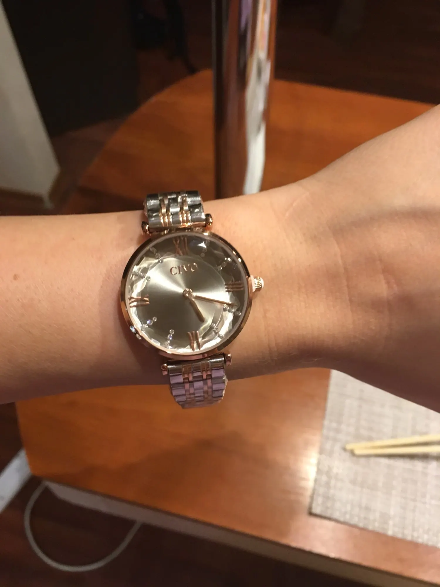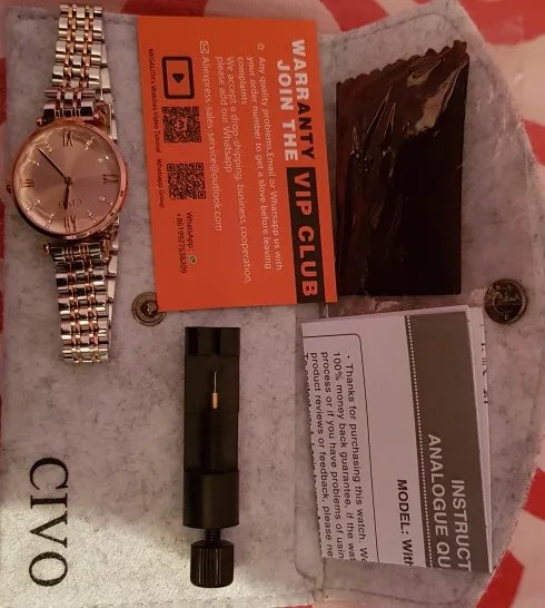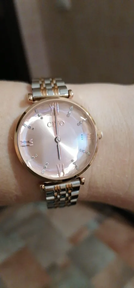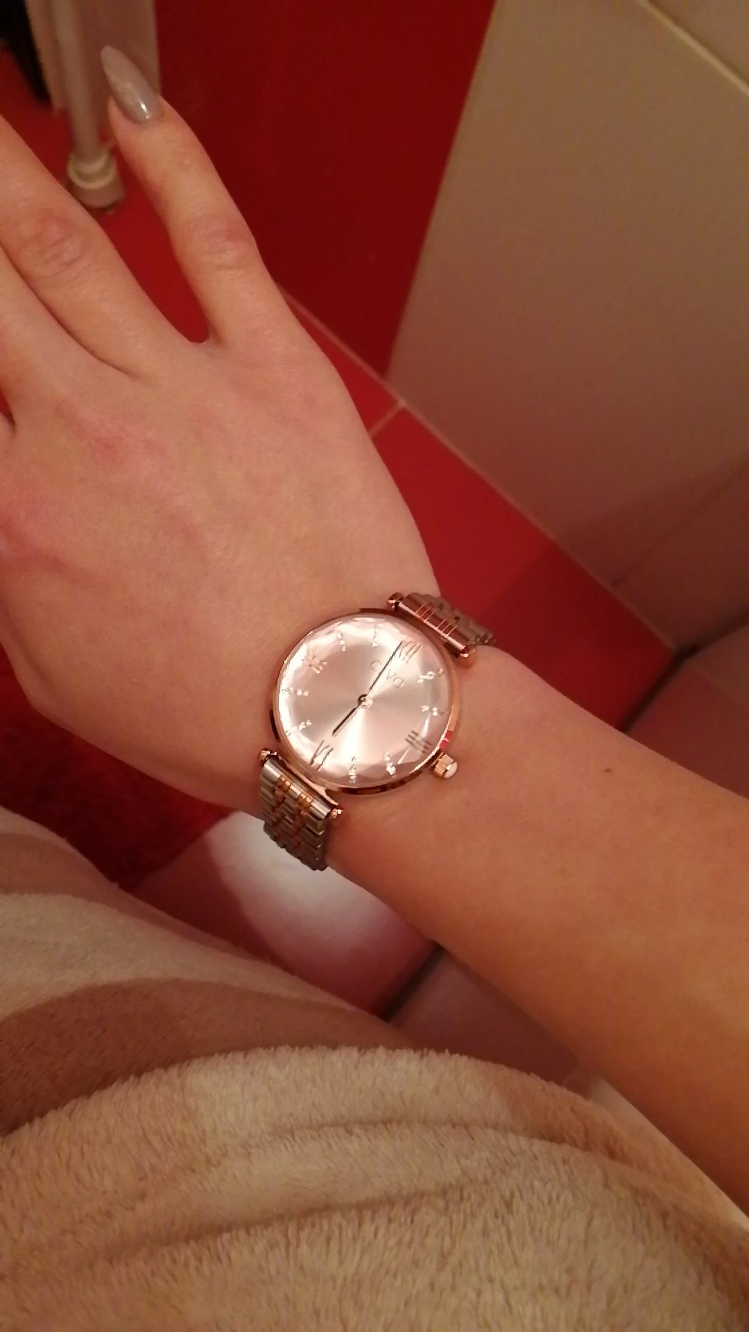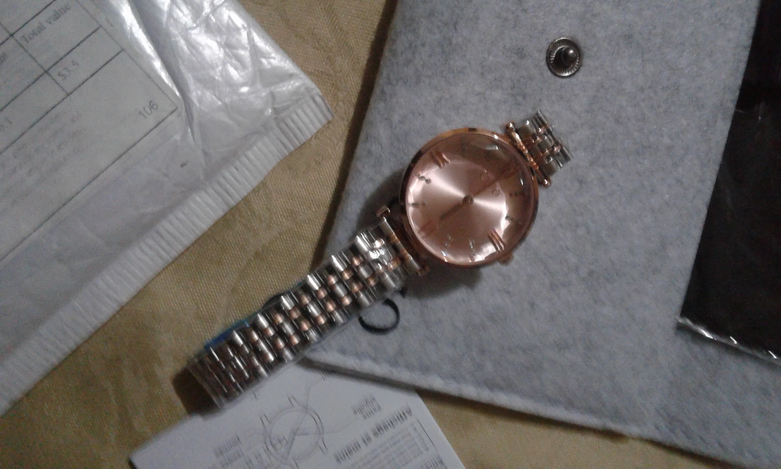 Часы понравились, на вид качественные, заявлена даже защита от воды. пришло в каком то сером типа тонкого войлока кошельке, бумажки всякие на разных языках, кроме русского. специальная штука для уменьшения браслета. тряпочка для стекла. Минус что в темноте циферблат не светится. Сами часы были в прозрачной плёнке, даже браслет ей затянут был, и стопор стоял пластиковый на колесике, что удивило. Видно что хоть и не очень известный китайский брэнд, но стараются красиво подать свой товар. Сравниваю со своими Casio, которым уже больше 10 лет, но там и цена другая конечно, и качество соответствующее. Так часики смотрятся отлично, жена довольна. посмотрим сколько прослужат.