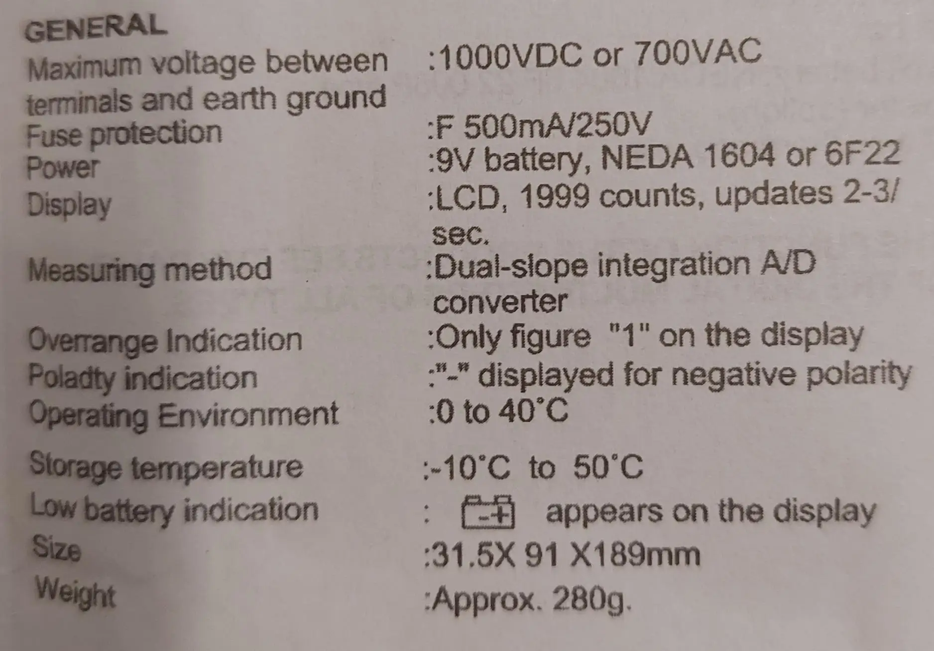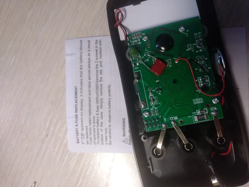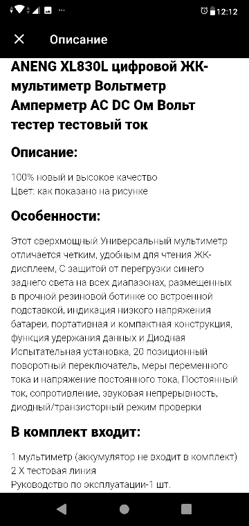 Соответствует описанию на 200% :))) А чего вы ещё хотите от такого аппарата? Чтобы кофе заваривал? :)) Купил, чтобы в гараже валялся на всякий случай. При замыкании контактов ноль не показывает. В розетке нормально показывает. В мануале сказано, что можно легко заменить предохранитель, открутив два шурупа. На самом деле то ли нет его, то ли он впаян, см. на фото слева на плате. Описание: 100% новый и высокое качество Особенности: Этот сверхмощный Универсальный мультиметр отличается четким, удобным для чтения ЖК-дисплеем, С защитой от перегрузки синего заднего света на всех диапазонах, размещенных в прочной резиновой ботинке со встроенной подставкой, индикация низкого напряжения батареи, портативная и компактная конструкция, функция удержания данных и Диодная Испытательная установка, 20 позиционный поворотный переключатель, меры переменного тока и напряжение постоянного тока, Постоянный ток, сопротивление, звуковая непрерывность, диодный/транзисторный режим проверки
