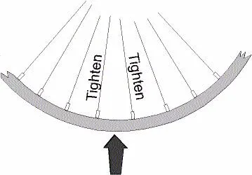 B. Если обод коснется правого борта, найдите наиболее близкое отклонение ниппеля от центра, исходящее от левой стороны фланца ступицы.Затяните ниппель 1/2 разворота. Перемещайте колесо вперед и назад в этой области и снова проверяйте отклонение.Вращайте колесо и найдите другое боковой отклонение с помощью индикатора. Снова медленно и остановить обод, где обод подходит к Индикатору. Найдите наиболее близкий ниппель, расположенный в центре отклонения, затяните ниппель. Если ниппель выглядит особенно плотно, ослабьте спицы на той же стороне, что и индикатор потертости.Повторите, пока Колесо не будет верным. Колесо соответствует действительности, если оно качается менее 1/16 ”(1,0 мм).Очистите тормозную поверхность обода растворителем, таким как спирт или очиститель окон.Радиальный центровкаОбод колеса может быть перемещен в центр. Другой способ просмотра-вверх и вниз. На этот радиальный вид колеса может повлиять натяжение спицы. Секции обода можно перемещать к ступице, затягивая спицы. Кроме того, секции обода могут слегка двигаться наружу, ослабляя спицы. Обычно лучше всего работать с помощью пар спиц. При работе с сопредельными левыми и правыми спицами у колеса меньше тенденции к тому, чтобы оно не было истинным.