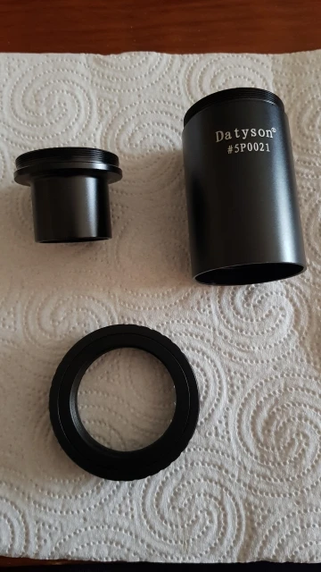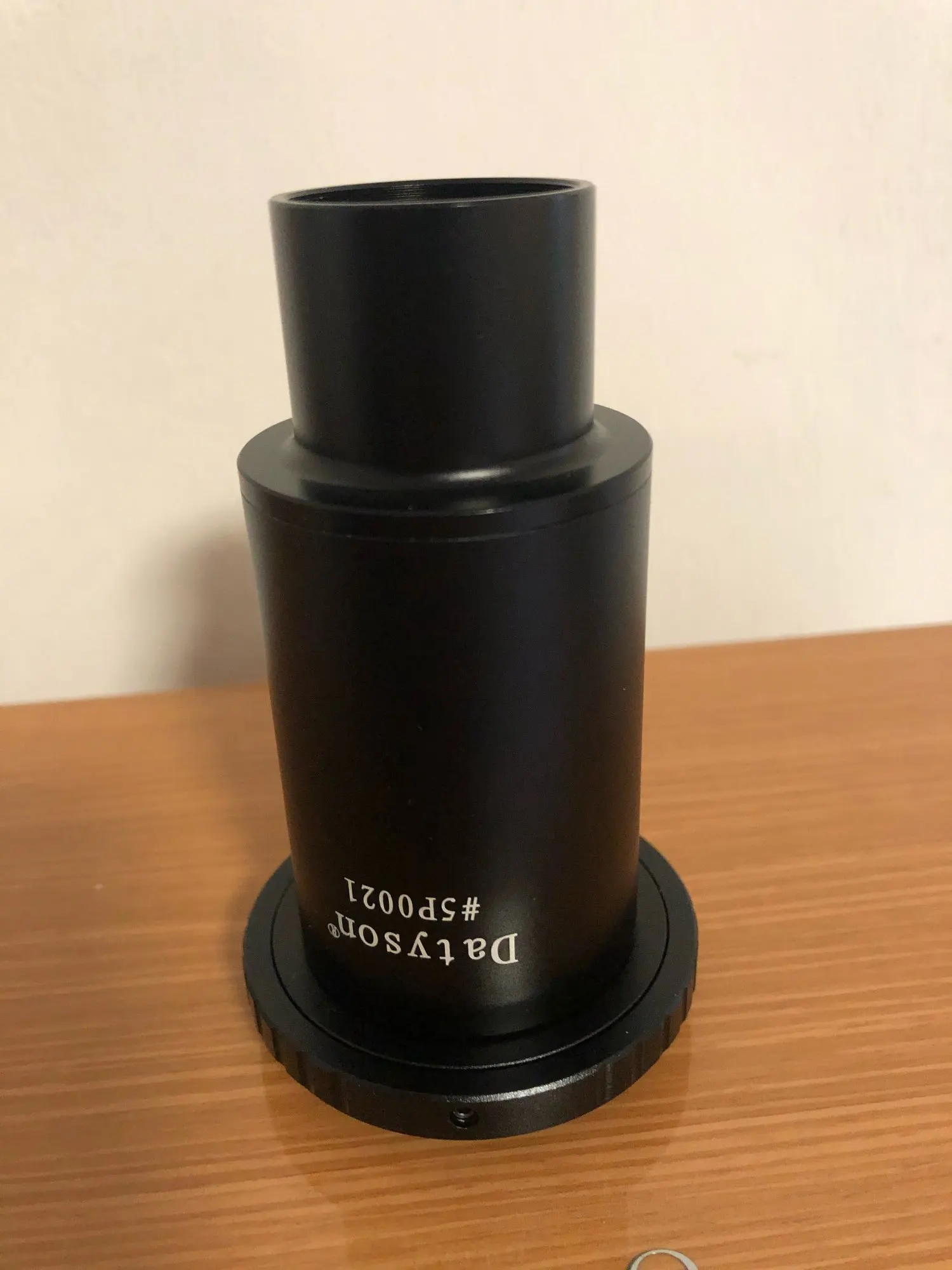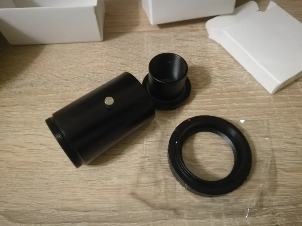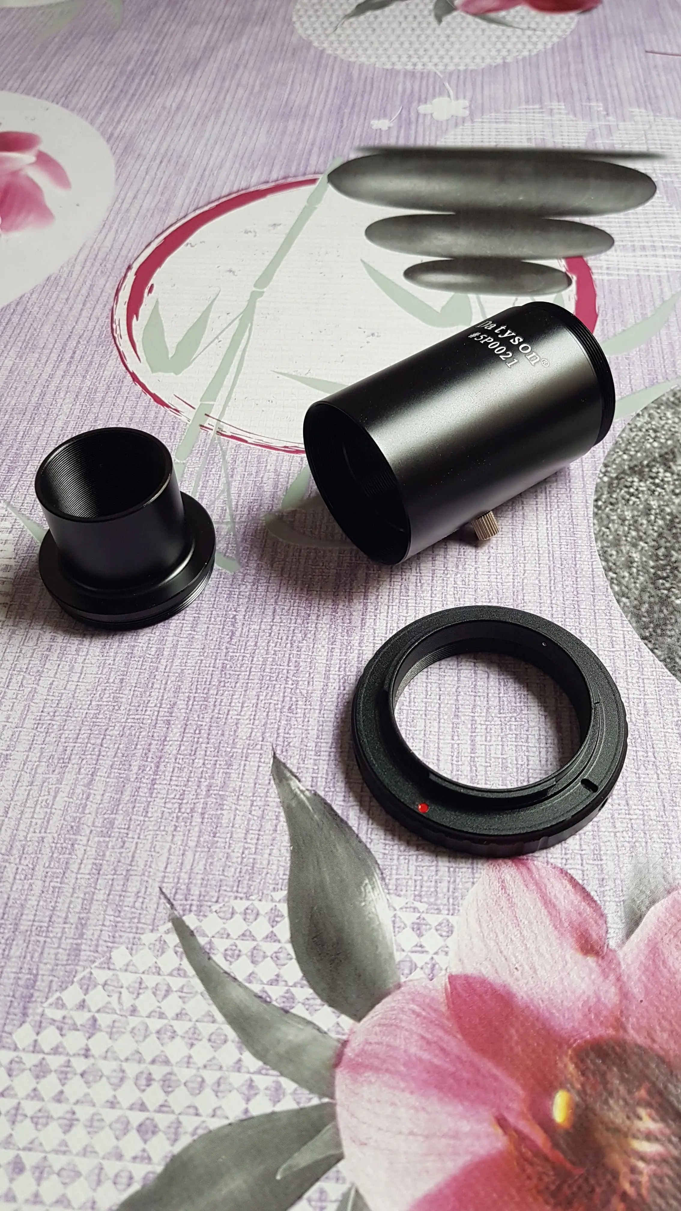 Отличный переходник, тяжёлый, из металла. Приятно в руках держать и использовать. В комплекте кольцо на байонет Никон Ф, удлинитель и Т-кольцо под телескоп. Можно пользоваться без удлинителя, напрямую соединив Т-кольцо и кольцо байонета. На всех деталях есть резьба. Рекомендую этот товар.