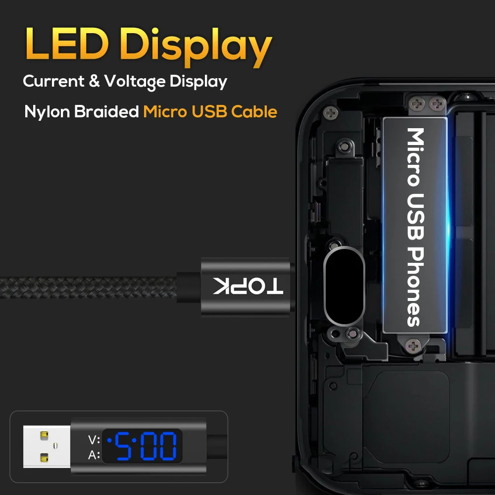 Кабель TOPK Micro USB, 1 м, для зарядки и передачи данных, с цифровым светодиодным индикатором напряжения и тока, в нейлоновой оплетке, для Samsung, Xiaomi