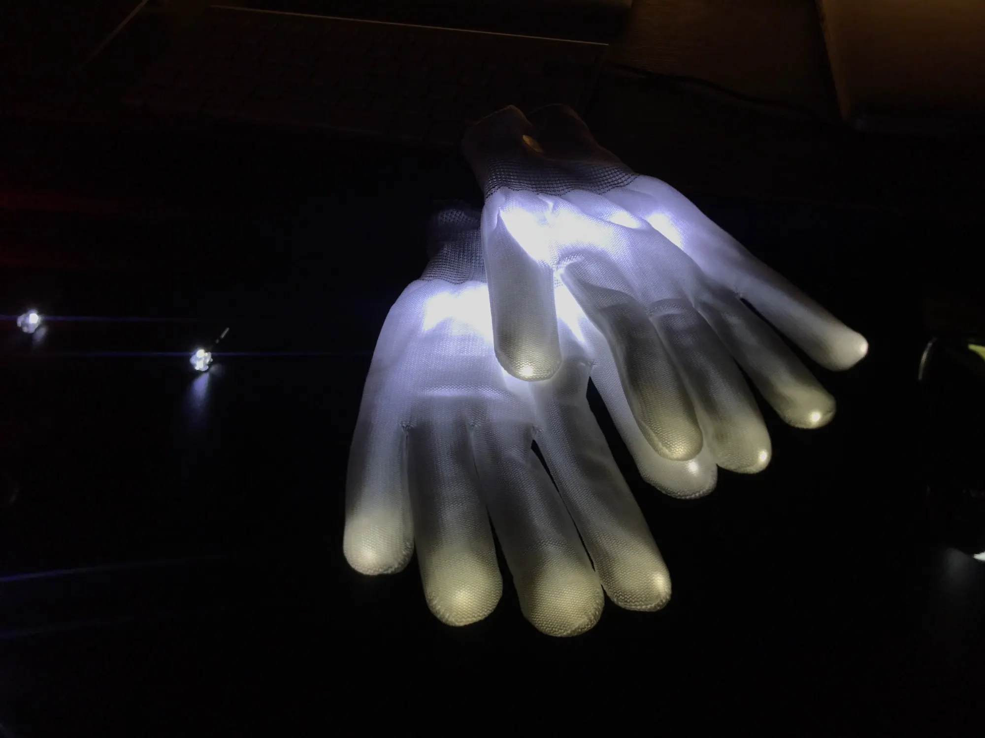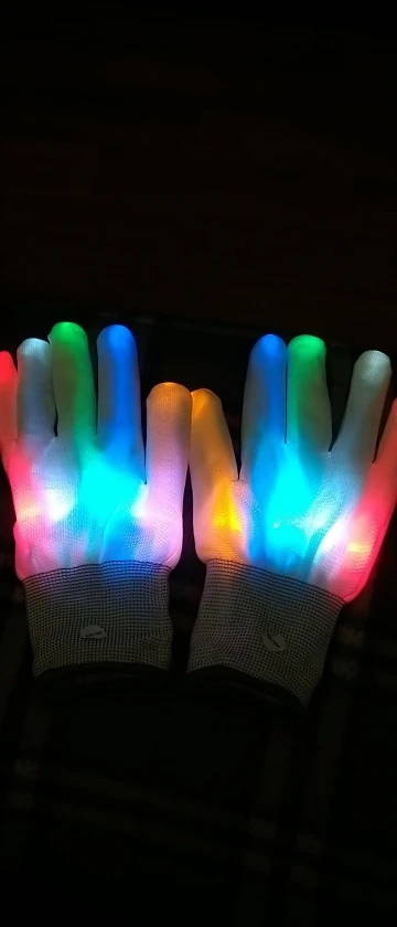 счастлив до соплей) вытаскивает бумажку из перчаток и после нажатия на кнопочки всё сияет. Нитки не торчат, достаточно тёплые для помещения, но не заметил чтобы руки потели) по уровню схожести с фото, представим что выдаваемый на фотках магазина свет - 100%, в жизни они светят на 93%, что достаточно ярко, чтобы радовало глаз в целом нареканий нет
