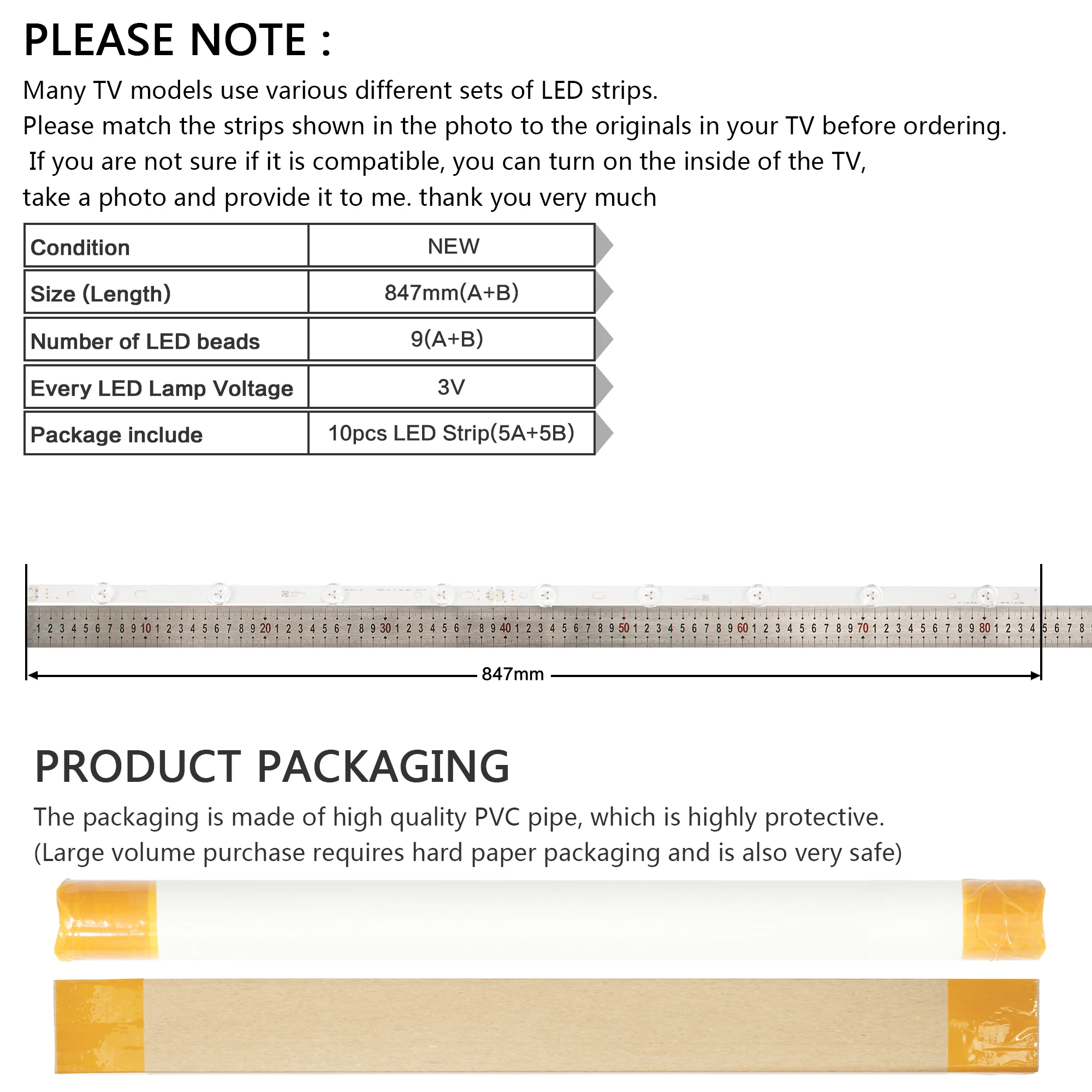 1. Перед заказом сравните полоски, показанные на фото, с оригиналами вашего телевизора. Если вы не уверены, совместим ли он, вы можете включить внутреннюю часть телевизора, сделать фото и предоставить его мне. Большое спасибо.