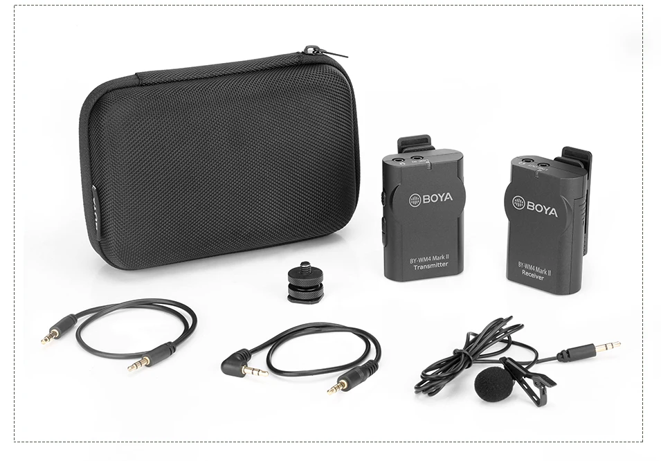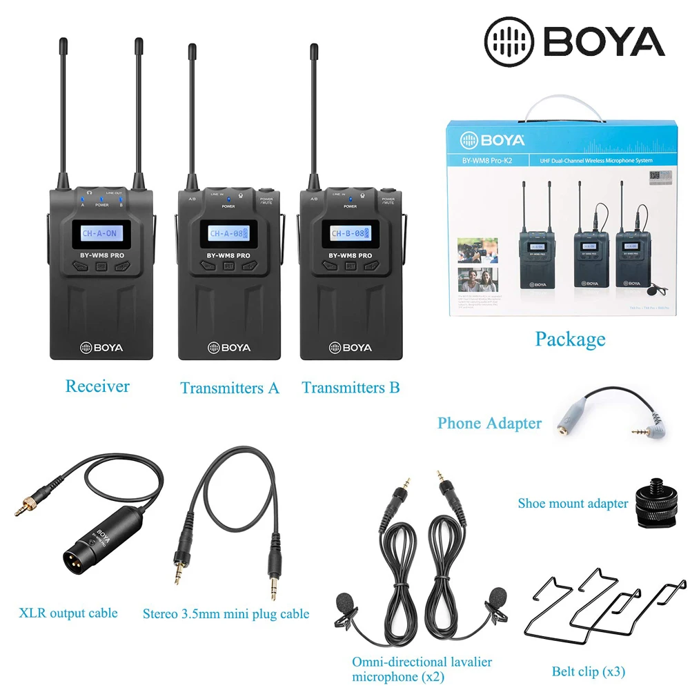 Система BY-WM8 Pro-K2 состоит из двух передатчиков, камеры-приемник с креплением и двух всенаправленных lavalier микрофонов. Также в комплект входит адаптер для крепления обуви, один выходной кабель 1/8 "-XLR, один выходной кабель 1/8-1/8", Чехол для переноски.