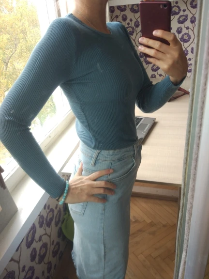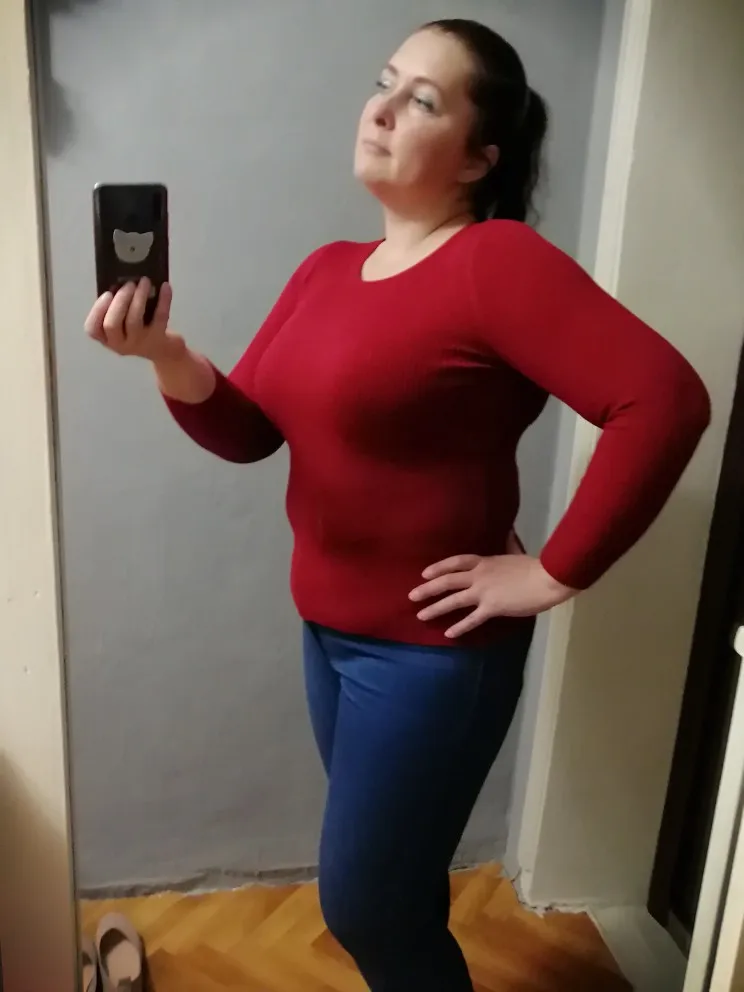 Восторгу нет предела , уж слишком классная кофточка. На 42-44 не в облипку, очень комфортно ощущаю себя в ней. Не короткая. Если есть возможность,выбирайте пункт выдачи в Пятерке, дошло до МО за 10 дней.