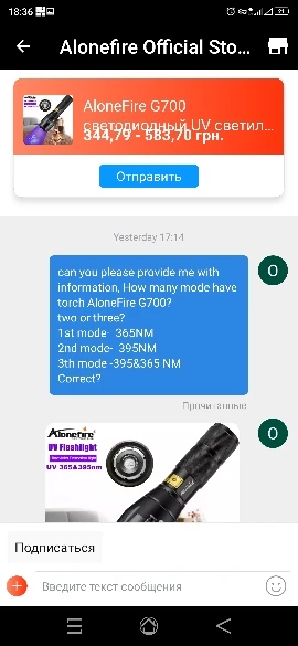 Хороший фонарик, все таки режимов два - поочередно 365 или 395, гибридного режима нет. Доставка была очень быстрая, меньше недели, в москву.