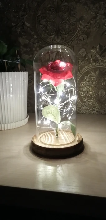 товар получил в целости. упаковка помята но не критично. ожидал что на картинке лучше чем в реальности но нет, был удивлен что в реальности так же хорошо выглядит. колба не как не крепится но ее можно аккуратно на термоклей посадить (это так мелочи и мысли в слух). вообще я очень доволен, покупал девушке на день рождение (ей тоже очень понравилось). колба хорошая - толстое стекло. батареек не идёт в комплекте.РЕКОМЕНДУЮ. P.s. не жалею о потраченных деньгах и времени.