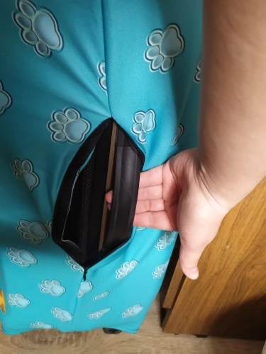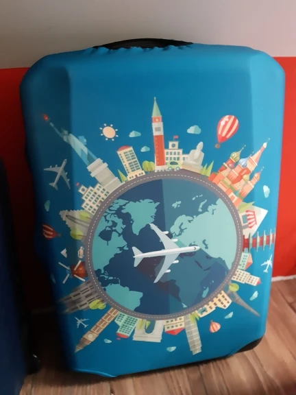 Посылка пришла через месяц. Качество чехла очень хорошее, все прорези, швы обработаны, нигде нитки не торчат, все аккуратно прошито. Для боковых ручек есть скрытая молния с двух сторон для разных моделей чемоданов Чехол хорошо тянется, на чемодан 70*45*26 размер L подошёл идеально. Из недостатков только то что цвет недостаточно яркий как на фото.
