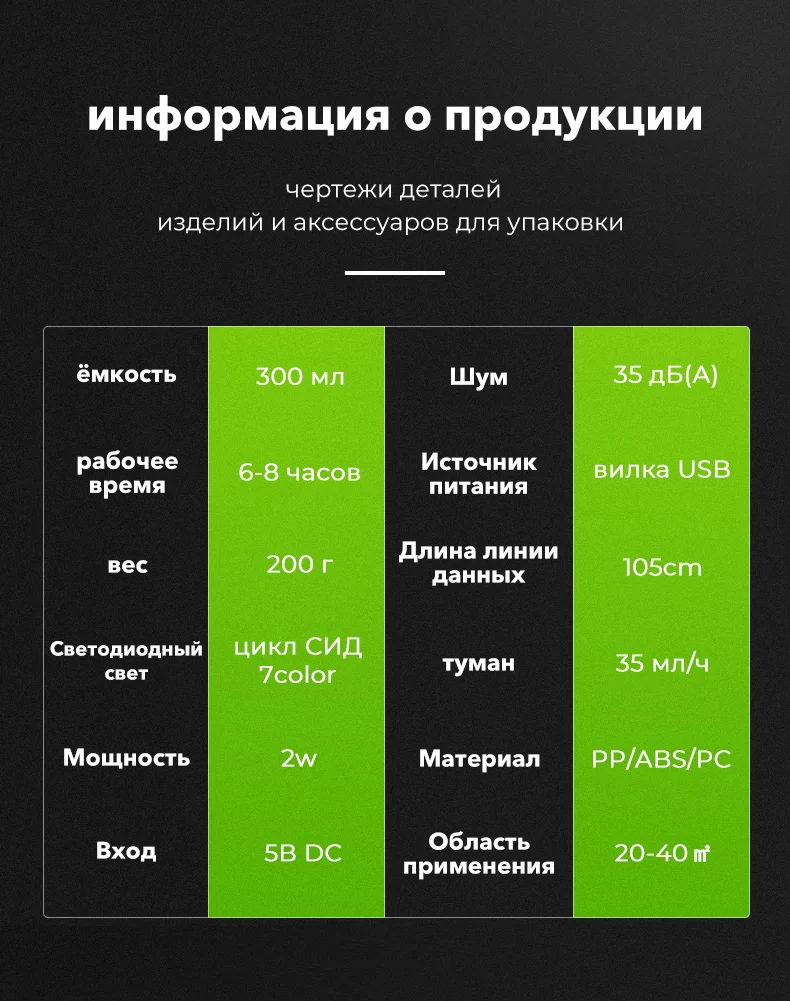Хороший увлажнитель, работает от USB-шнура. Наполняемость 250 мл до прозрачной части. Можно использовать 1 каплю эфирного масла, больше пишут нельзя, испортится. Пар холодный, чтоб пошел пар надо подождать минут 5 пока полностью пропитается весь фильтр. В комплекте сам увлажнитель, 11 фильтров, шнур USB, чёрная маска на глаза для сна, 2 инструкции по сбору, на цветной пишут по-русски. Упакована в дутый пакет, пришло все целое.