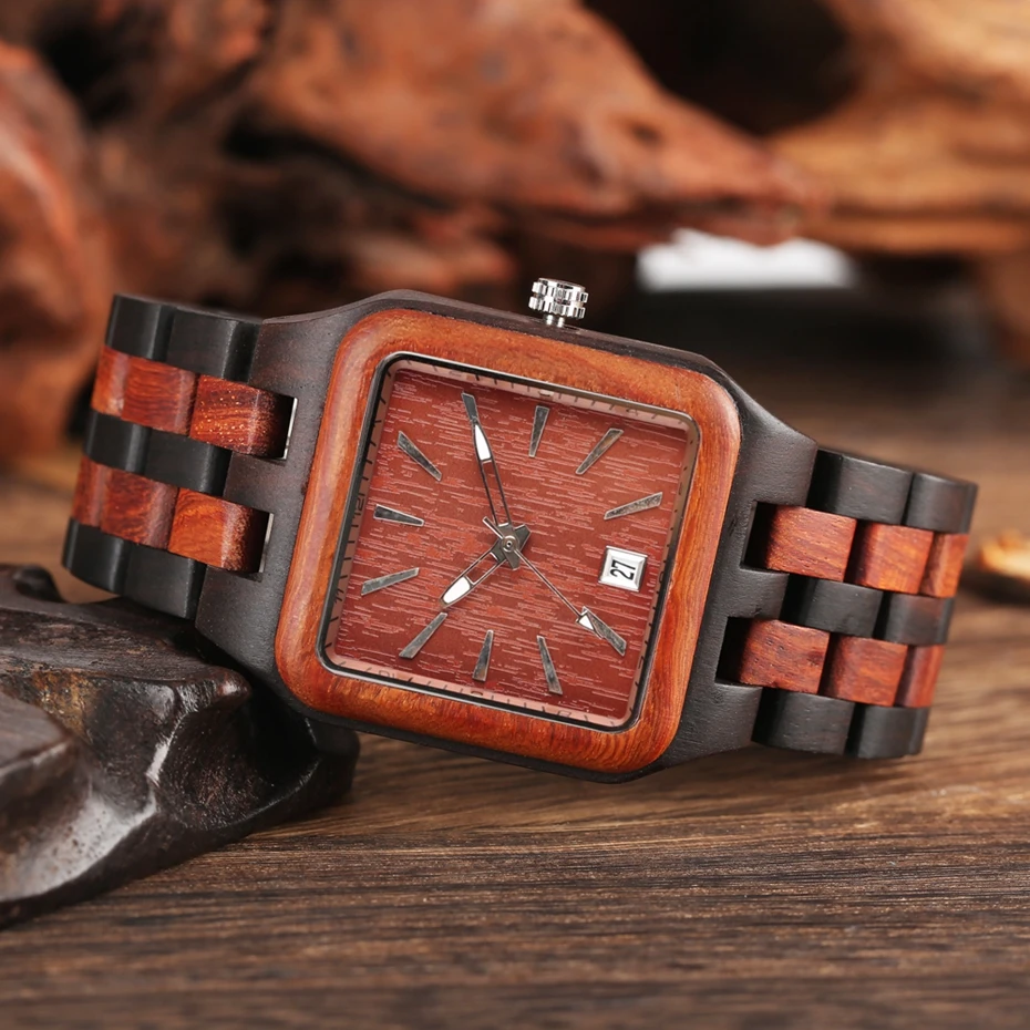 Уникальные часы с прямоугольным циферблатом Для мужчин Красное сандаловое дерево часы Для мужчин s с полный естественный древесный браслет с календарем Дата кварцевые наручные часы