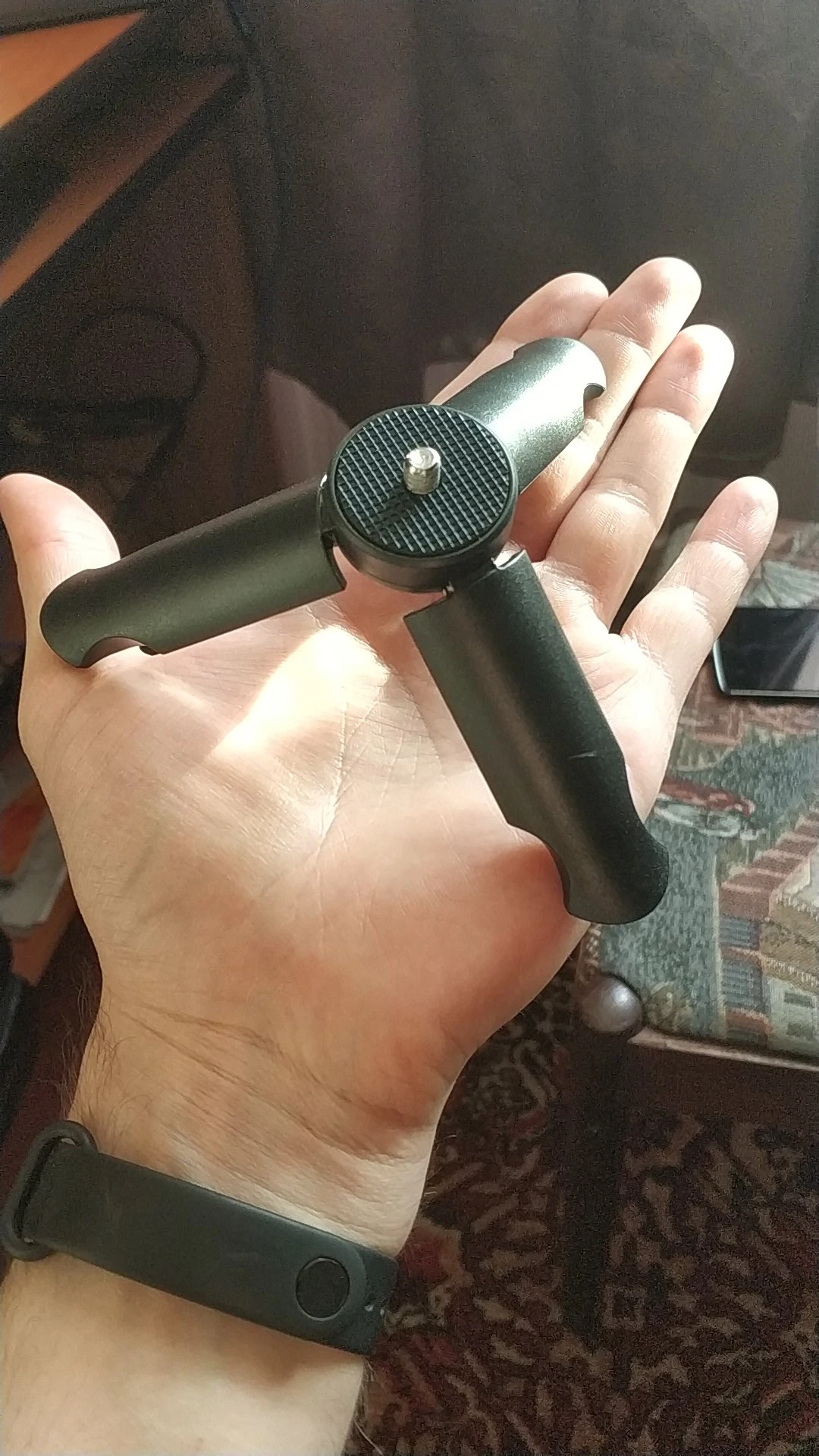 Достаточно компактный штатив. Приехал быстро, складывается в относительно небольшой размер. Резиновые ножки добавляют стойкости в разложенном состоянии. Разве что нет возможности ножки развернуть не на полный угол, поэтому если поверхность для установки небольшая, штатив может не поместиться и ножки могут слезать с краев.