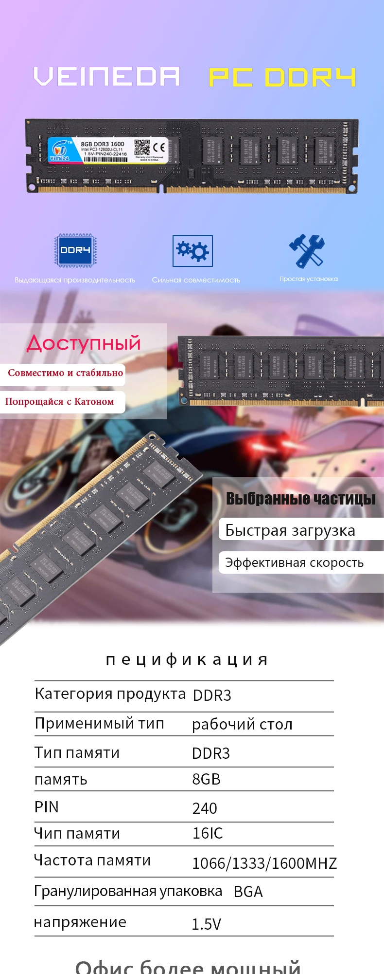 ОЗУ VEINEDA DDR3, 2 гб, 4 гб, 8 гб, память ddr3 8 гб, ddr 3 1333 для настольных ПК, совместимая с 1066, 1600, ПК, Память DIMM PC3-10600R, 12800R