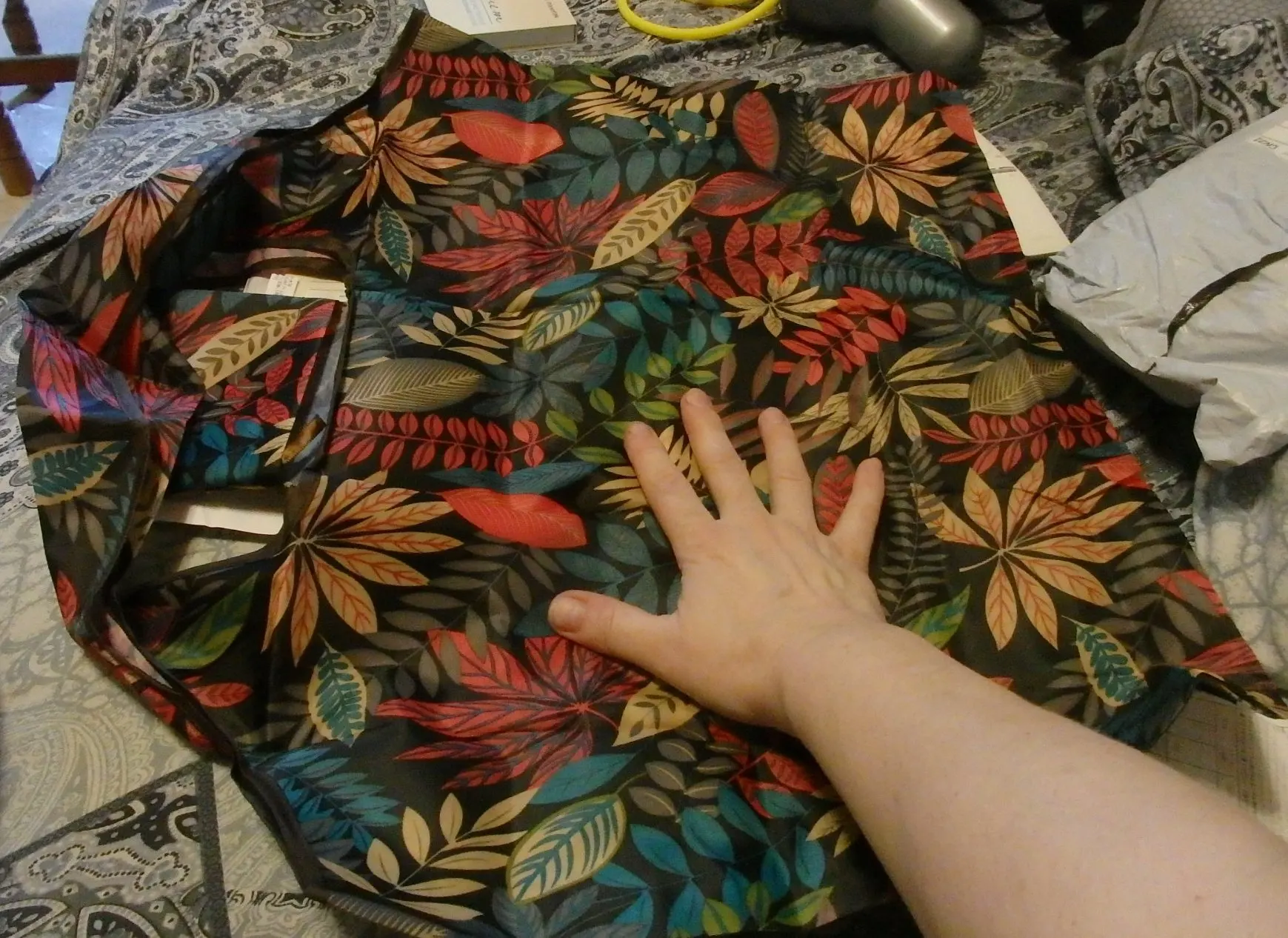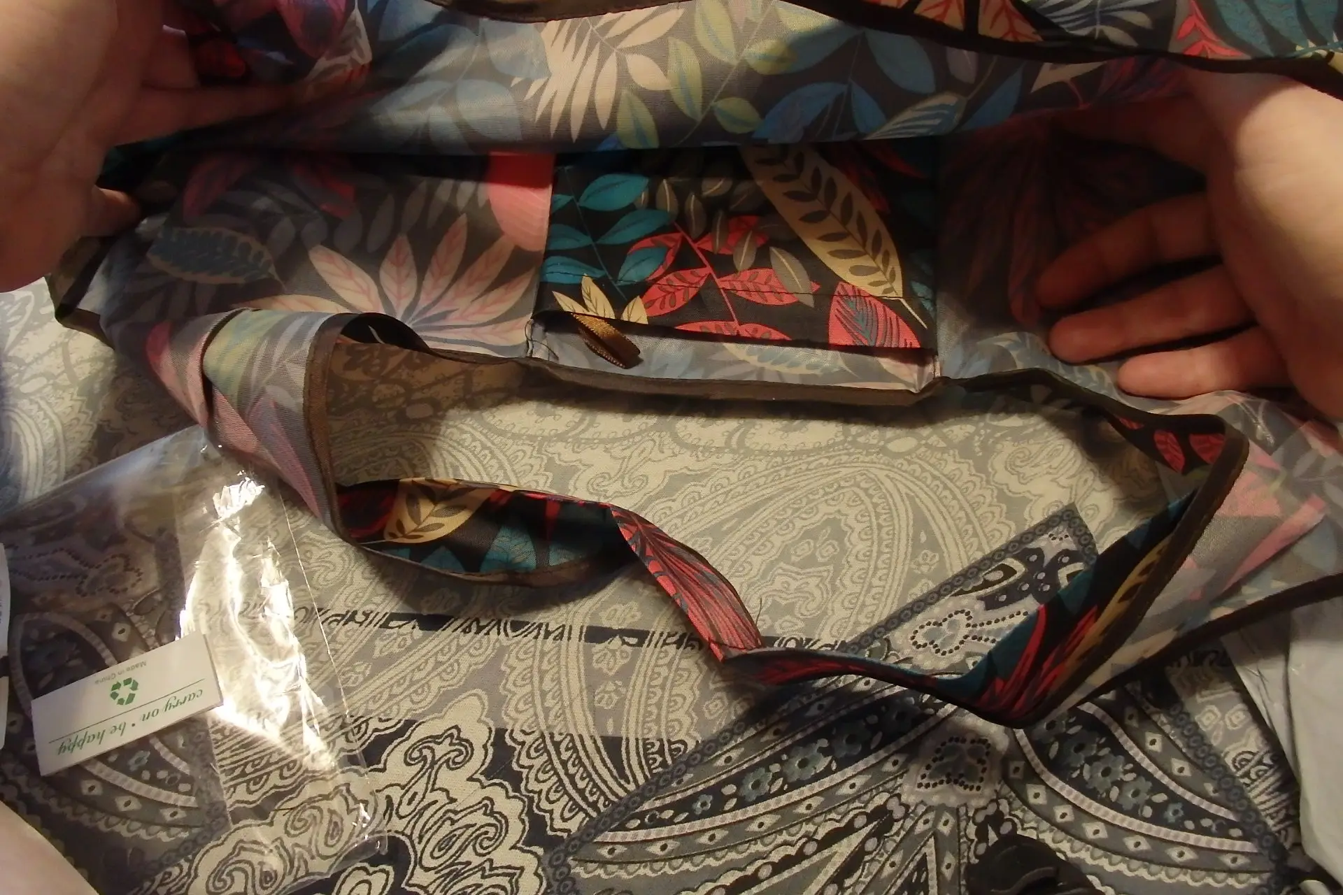 Сумочка большая, но не очень глубокая: ширина дна-47см, высота - 38см(без лямок)(ожидали бОльшего). В верху ширина немного шире(трапеция расширяется вверх), но не обещанная. Разложенная сумка в высоту вместе с лямками не длиннее 56 см. Даже если за лямки тянуть - то вытягивается не более чем до 60см. Если повесить на плечо, то у меня только до "шейки бедра" дотягивает(рост 176см). Хорошо складывается в микро-карман. Материал прочный, с красивым рисунком. Доставка быстрая - 13 дней. Спасибо продавцу! Хотелось бы размер побольше, как обещано. По 10 см по двум направлениям не дотянули.