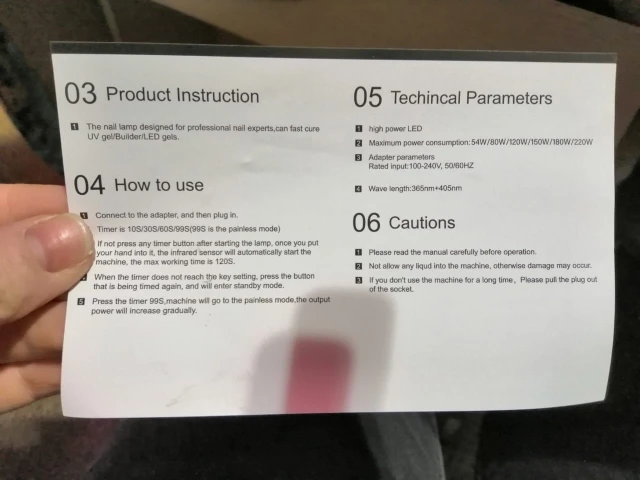 Товар пришёл быстро, доставлен курьером. Лампа классная, такую и хотела. Все работает, время предыдущей сушки запоминает. Сушит быстро. Там где кнопочка 99s это сушка на меньшей мощности (36 ват) рекомендую!!