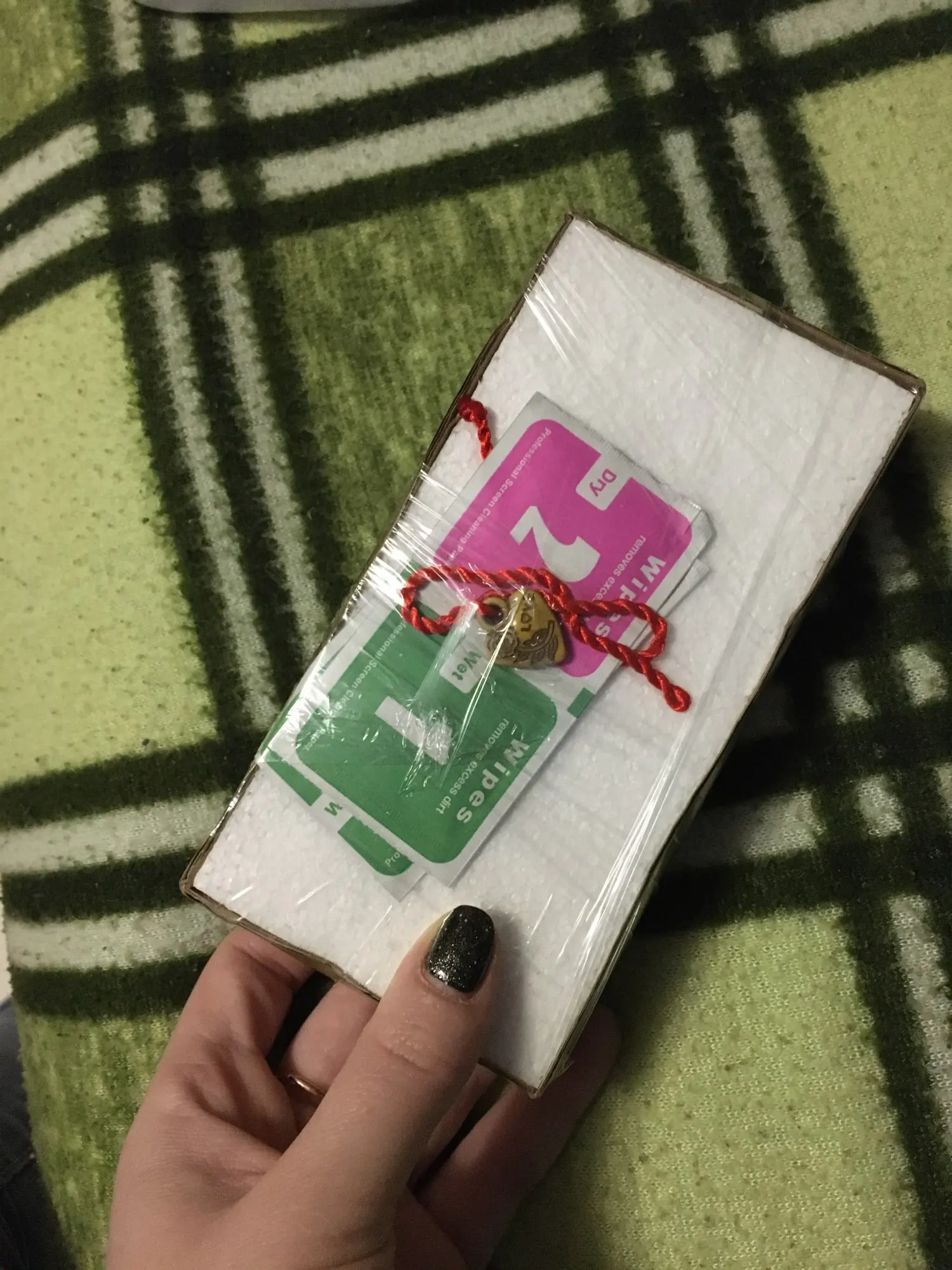 Пришло хорошо запечатанное стекло, с салфетками (на фото нет) и в подарок как всегда положили браслетик <3 заказ до Краснодара шёл достаточное время (месяц), но думаю это проблема в почте, которые не могли привезти заказ на дом.