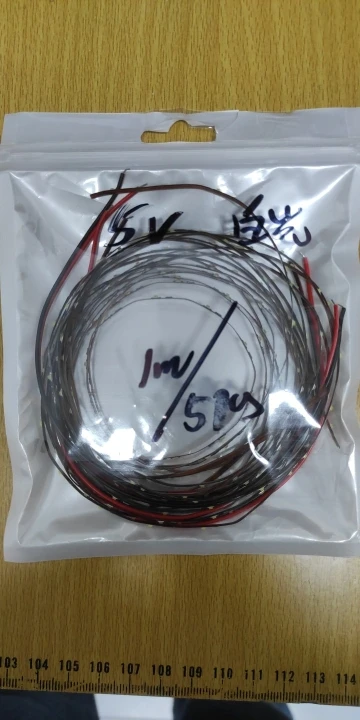 Прибыл всего за 14 дней. Набор из 5 полосок от одного метра, серая печатная плата шириной 2,5 мм с 60 светодиодами из водонепроницаемого материала. Каждая полоса нарезается на каждую светодиодную ленту (каждый светодиод соединен его резистором). Практичный источник питания 5 В с батареями или USB-палкой. Каждая полоса, такая же, как на фотографии, она Проводная с кабелем свинца два полюса красный/черный длиной около 15 см. Хороший intensita яркий 0805 SMD светодиодов.