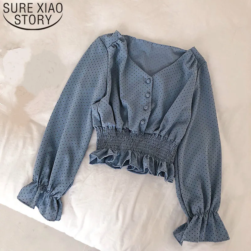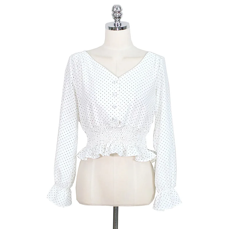 Блузка женская с V-образным вырезом и Расклешенным рукавом, элегантная рубашка в горошек, с оборками, на пуговицах спереди, 6602