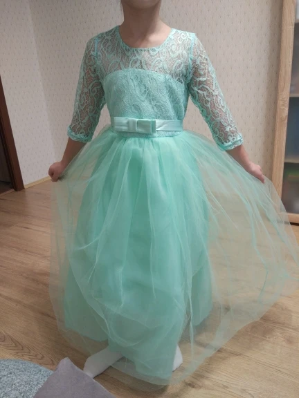 Подарок очень красивое! Цвет очень нежный, но и не бедный, ткань мягкая. На размер 9 пришло по бирке на рост 150 см, дочь 9 лет ростом до 130 см, ей платье ровно в пол, но не лежит на полу. Не очень понравилось, как пришит пояс - на 1-2 см выше шва юбки. Но, возможно, так и нужно.