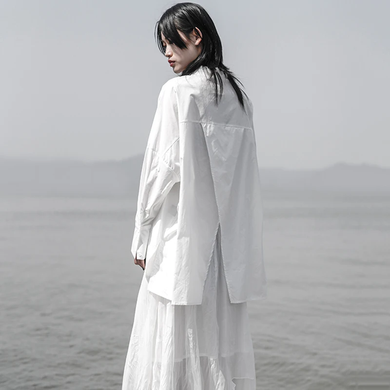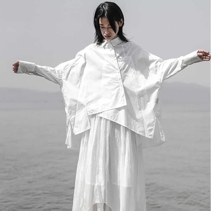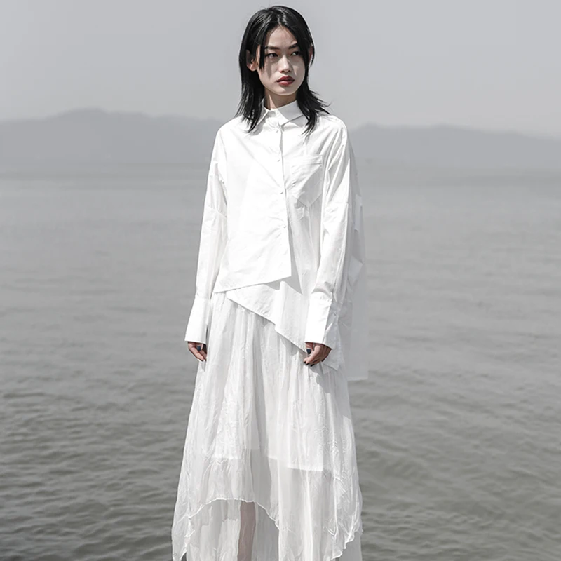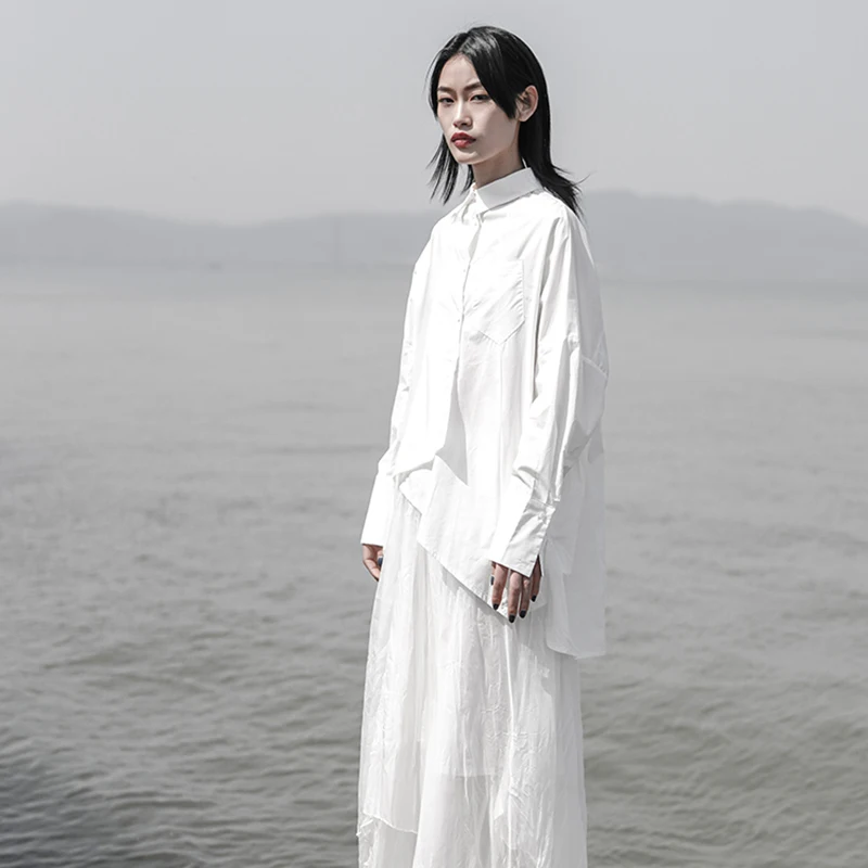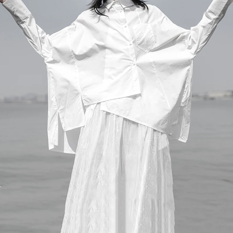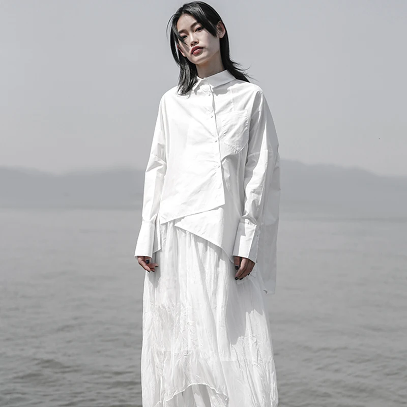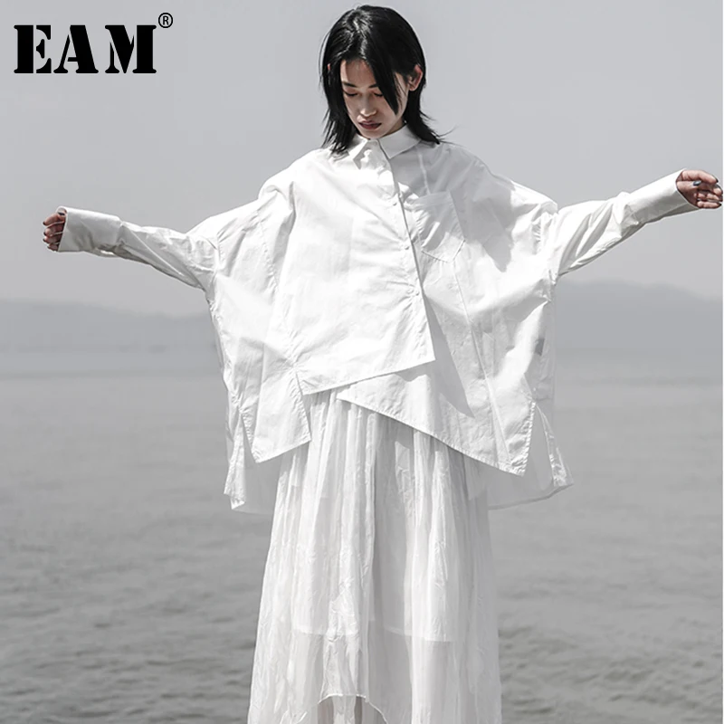 EAM 2022 Новинка весна осень отворот длинный рукав белый свободный оверсайз Асимметричная Свободная рубашка Женская блузка Мода JS921