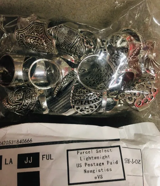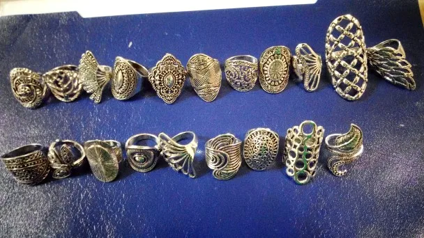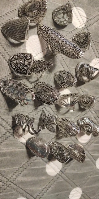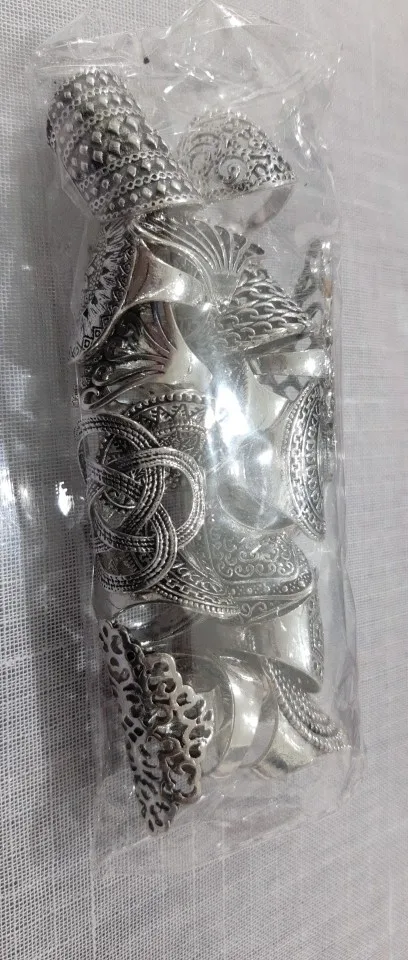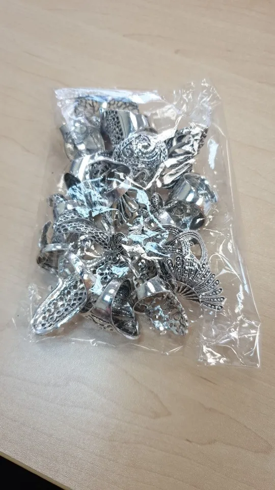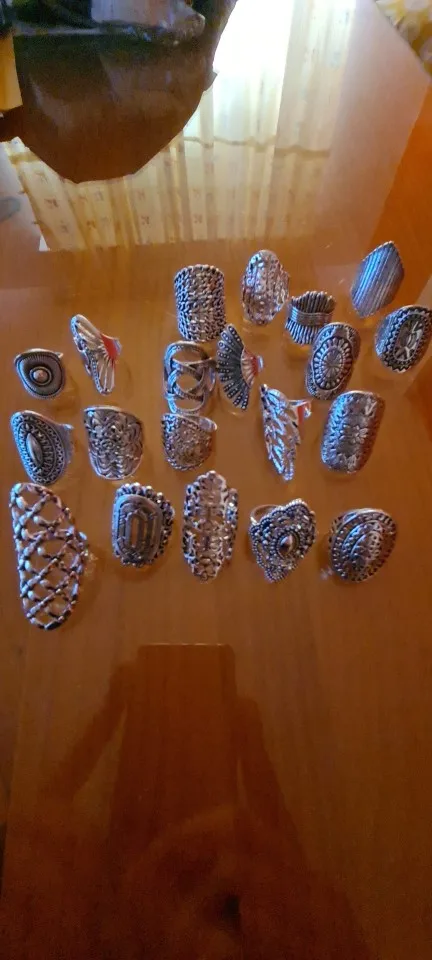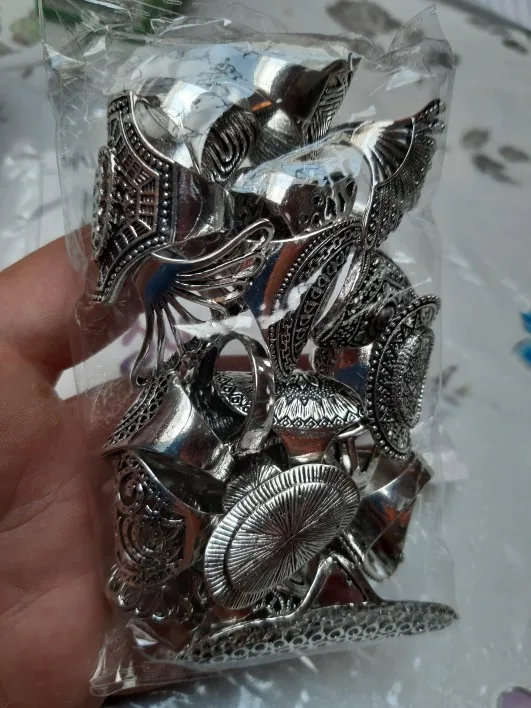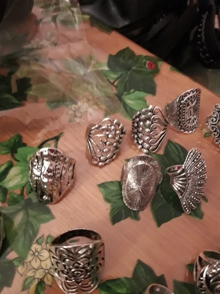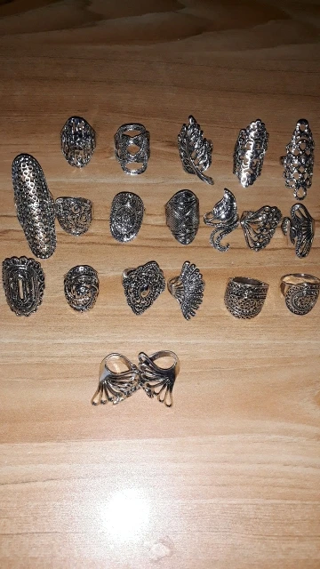 кольца классные 20 штук, размеры разные , много больших, не повторяются. так как предпологается носить на разные пальцы, все размеры подошли. Продавец отправил очень быстро, доставка в Пятерочку.