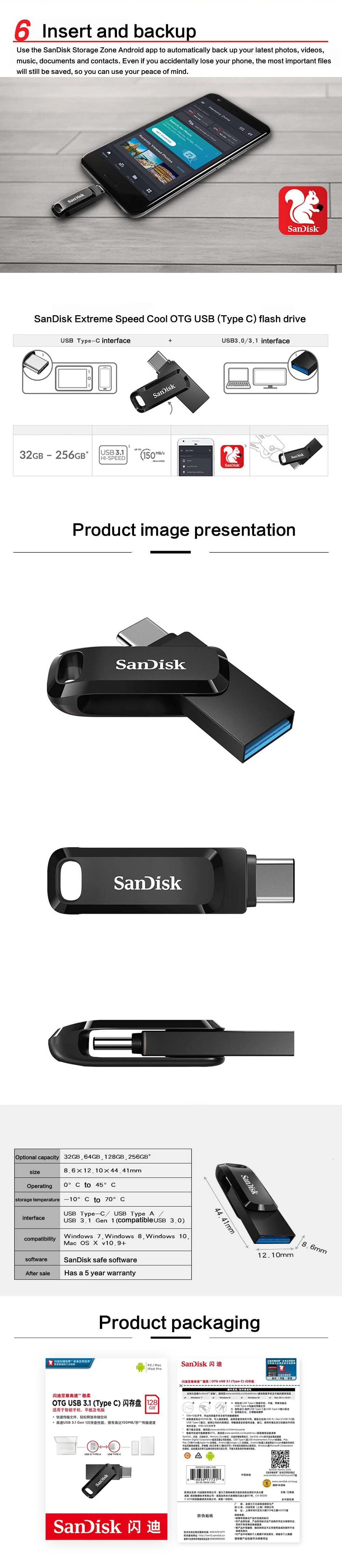 USB флеш-накопитель SanDisk OTG USB 3,1 Type-C 32 Гб 64 Гб до 150 МБс. Флешка 128 ГБ флеш-накопитель 256 ГБ для сотовых телефонов, планшетов, ПК, SDDDC3