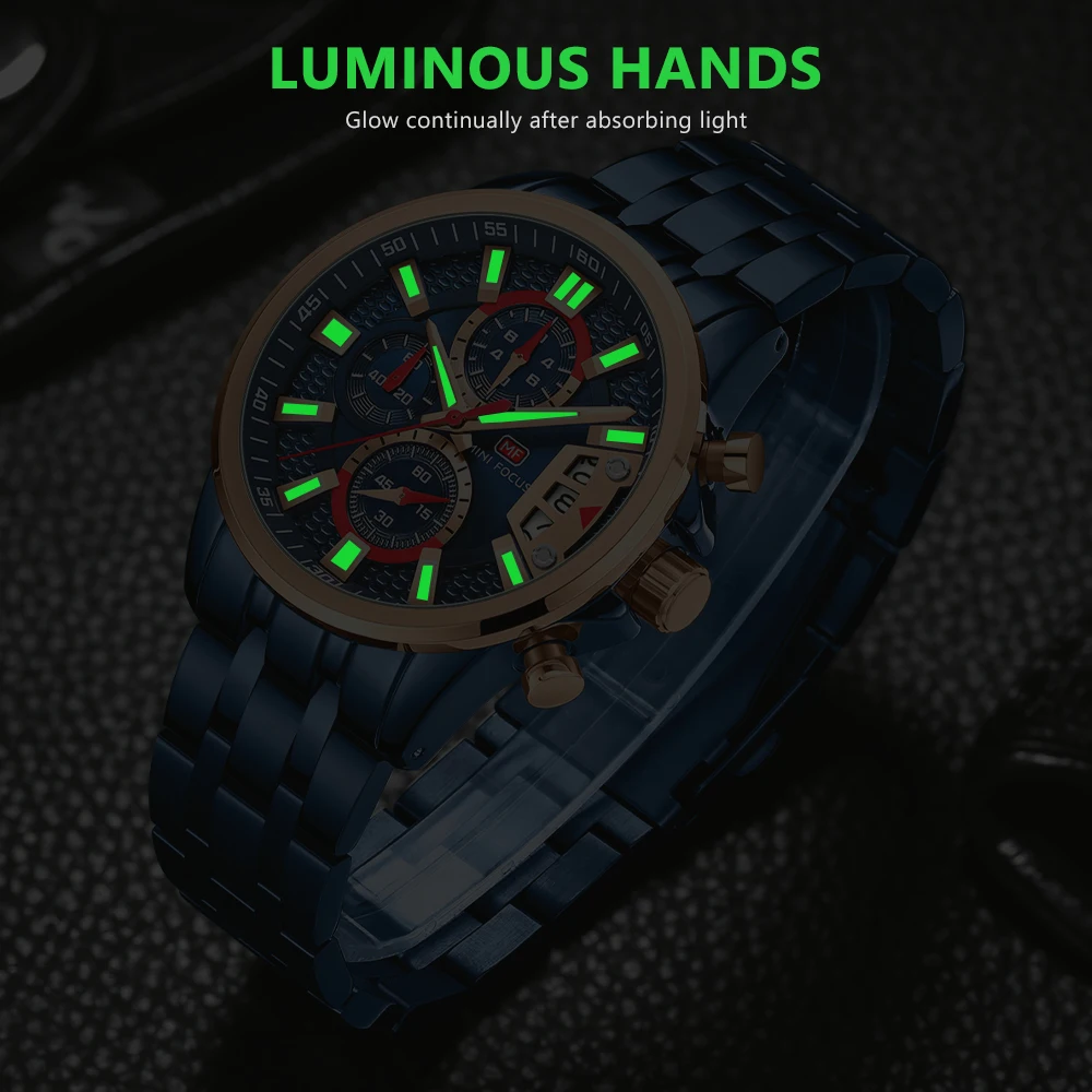 Роскошные мужские часы MINI FOCUSБренд: MINI FOCUS (MINIFOCUS)Стиль: Модный, Повседневный, деловой, роскошный, спортивныйОсновная особенность:1. Роскошные дизайнерские часы, модный стиль платья2. Новые модные тренды из нержавеющей стали ремешок часы.3. Гарантия на 12 месяцевХарактеристики:Диаметр циферблата: 42 ммЧехол Толщина: 11,9 ммДлина Часов: 219 ммШирина ремешка: 22,0*20,0 ммВес часов: 161 гМеханизм: кварцевый (требуется батарея)Материал зеркала: HardlexТип застежки: складная застежка с безопаснойФункция: суб-циферблат 1/10 секунды; Минутный суб-циферблат; Второй суб-циферблат; Отображение датыСветящиеся стрелкиВодонепроницаемость: Водонепроницаемость (не для плавания или душа)Подходящий Случай:Идеально подходит для всех случаев и мероприятий: вечерние, юбилейные, деловые, повседневные, спортивные, домашние или повседневныеПосылка включает в себя:Часы-1 шт. (подарочные коробки на выбор)