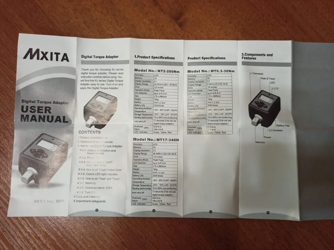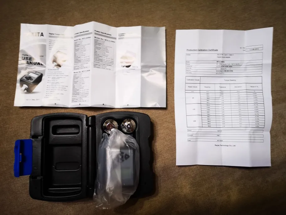 Дождался своего электронного динамомметрического ключа! Приехал без батареек. Выбирал с огромным диапазоном измерений моменетов 2-200 Н/м. Поставил батарейки не разобрался как он работает и увидел что диапазон начинается с 20 Н/м, растроился и было даже собрался отправлять назад. Я механик мотоциклов, и самый частый номинал у нас 10Н/м. Сегодня пошёл к машине, предварительно рочита инструкцию на английском и наонец то разобрался! Прибор действительно точно измеряет момент в указанном продавцом диапазоне, радости нет границ! Настоятельно рекомендую к покупке! Кроме инструкции в пластиковом кейсе с которым он пришёл, помимо инструкции есть поверочная таблица с впечатанным серийным номером прибора, всё серъёзно!