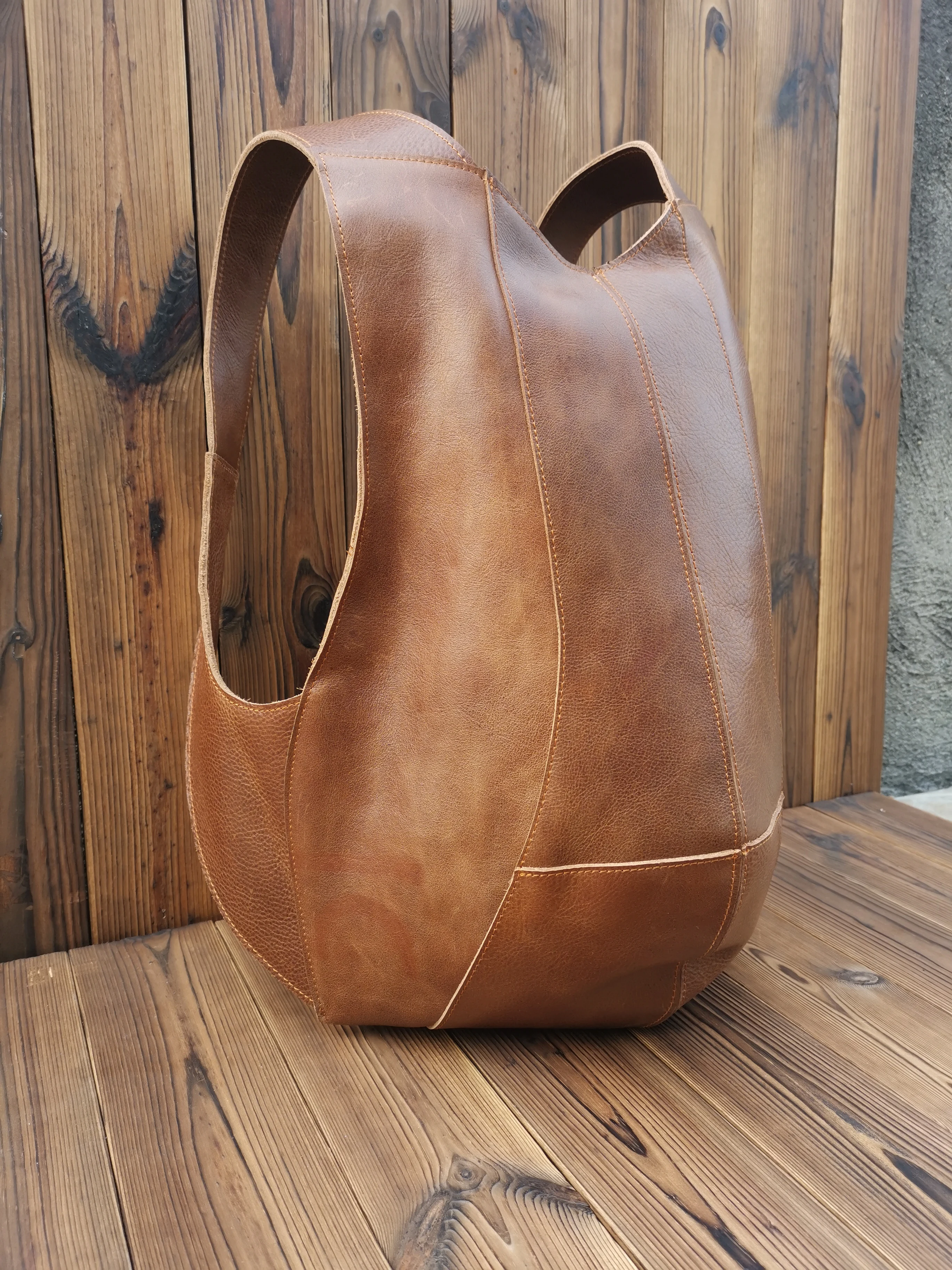 Вроде кожа, но довольно странной выделки, похоже на резину. Рюкзак большой, во всю спину, лямки широкие, сидит довольно удобно.