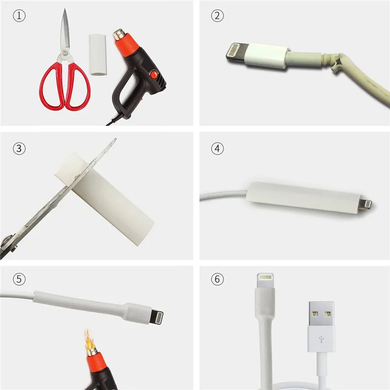 Ожидал, что будет плотно прилегать. Получается плохой результат. Самая маленькая трубка по диаметру не подходит, хотя чуть больше и было бы отлично. Следующий размер трубки заходит слишком свободно (большой) и не обжимает полностью сколько не грей. Провод iPhone. Не подходят для такого провода эти трубки.