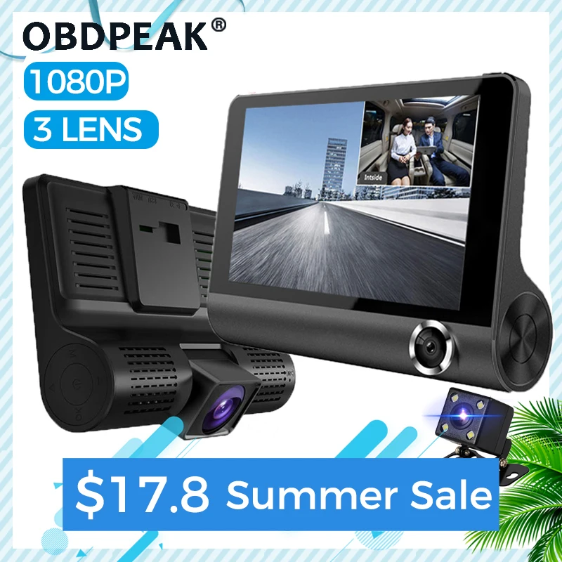 Автомобильный видеорегистратор OBDPEAK A800 с 3 объективами камеры 1. Вид спереди 2.Car Inside View 3. Вид сзади