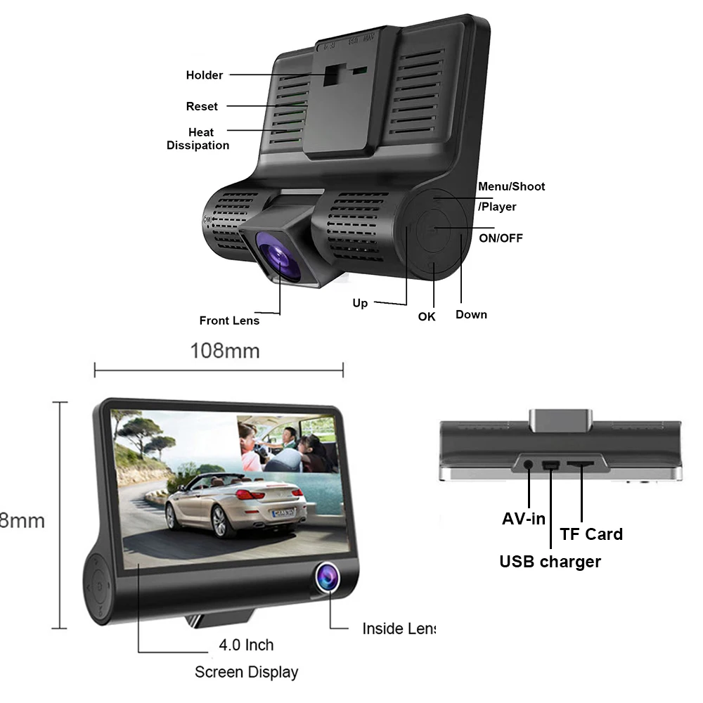 Функции: g-сенсор, цифровой зум, обнаружение движения, циклическая запись, отображение времени и данных, с зеркалом заднего вида, широкий динамический диапазон, светодиодный светильник