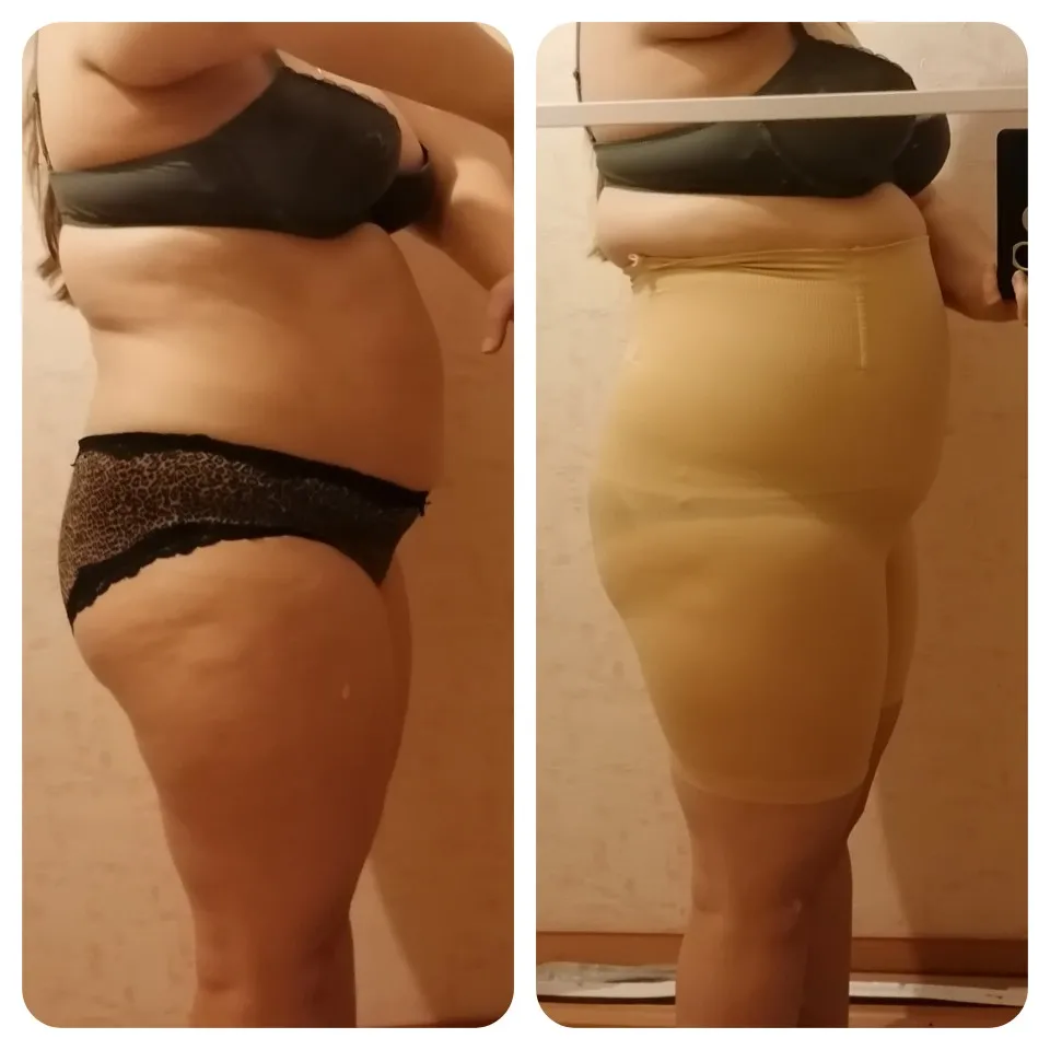 Утяжка очень хорошая,на параметры 80-105 взяла XS S, одевать тяжело,зато хорошо затягивает,единственный минус -цвет не телесный,а желтоватый