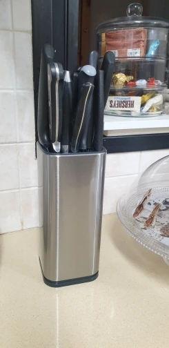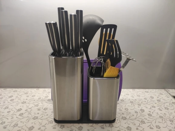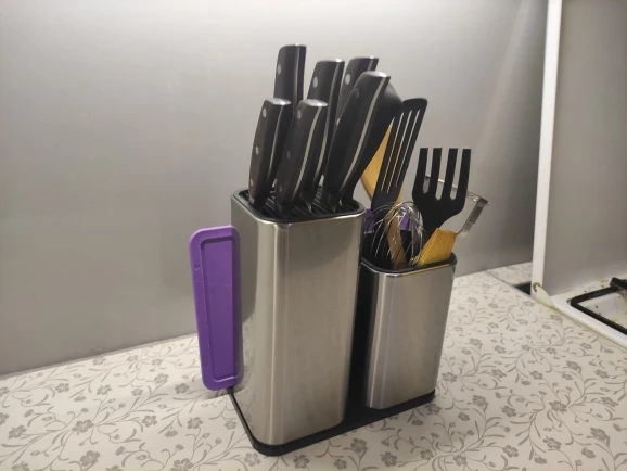 Красивая, качественная подставка. Доставили в Ростовскую область за 3 недели. Упаковано было хорошо, поэтому все целое. Набор из шести ножей поместился отлично и ещё место для ножниц есть. В соседний стакан поставил всякие половники, а сзади место для разделочной доски.