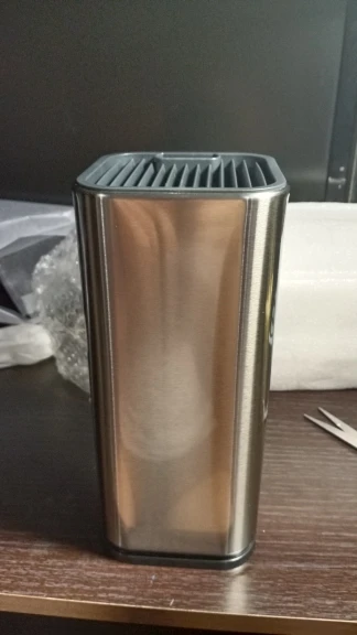 Доставка 16 дней Новой почтой, посылка была объединена с 5 другими заказами, упаковка достойная в пенопластовый бокс, все дошло целым, был небольшой косяк, с одной стороны вдавлена пластмассовая подставка, вопрос решен за 15 секунд, подставка с металла, смотрится очень хорошо, ножи в отверстиях фиксируются, влез даже кухонный тесак, внизу на дне отверстие для слива воды. В общем и целом вполне хороший держатель.
